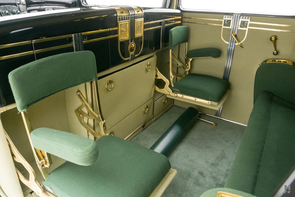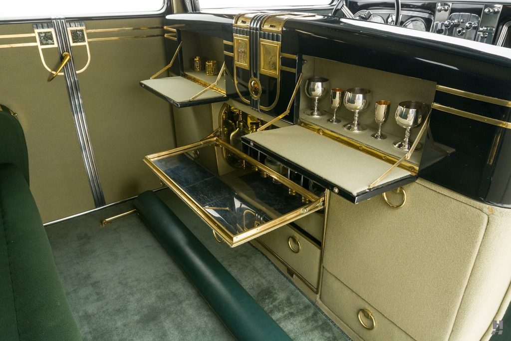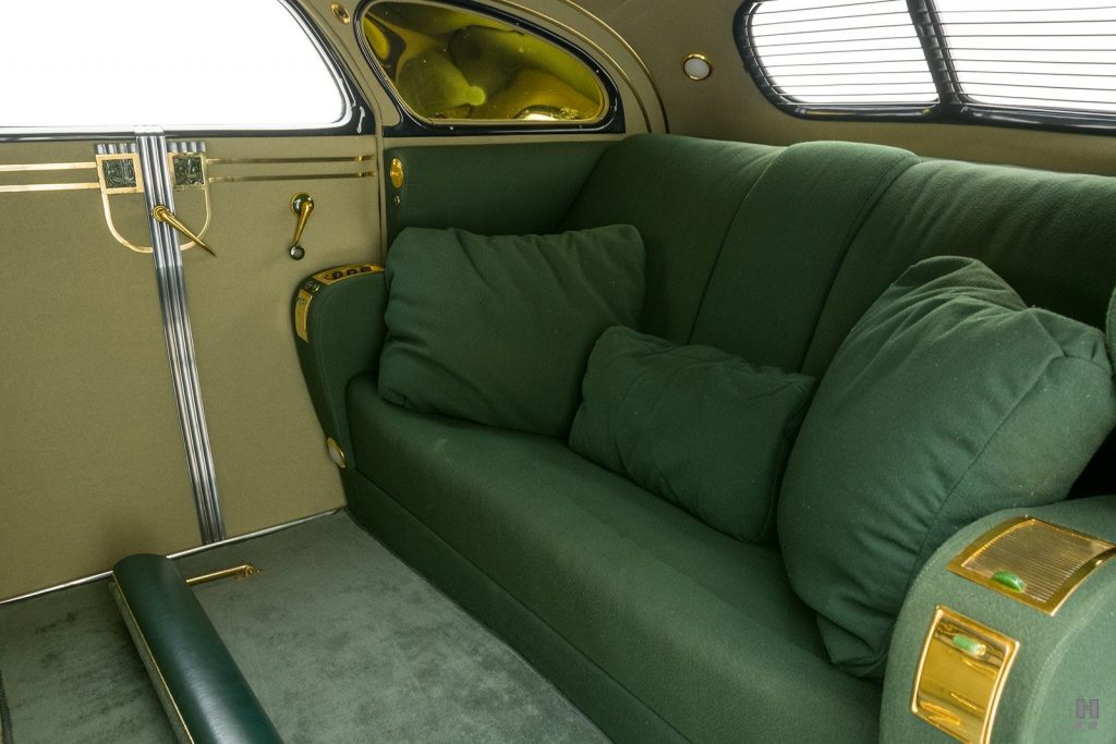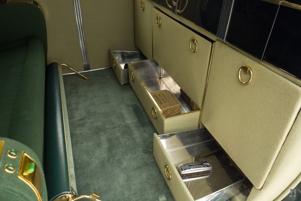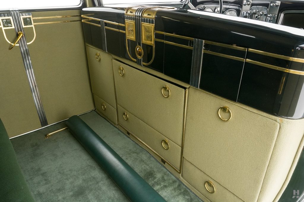 : 1937, CW Imperial Airflow par LeBaron, 1/3, vitres de custode arrières obturées, séparation à commande électrique avec cocktail cabinet avec éléments en argent sterling, 2 humidificateurs, radio à l’arrière, vanity set avec prise pour rasoir, montre Jaeger, baromètre et boussole, sièges occasionnels repliables, tous éléments chromés plaqués or, éléments décoratifs en jade dans les garnitures de portes, garnitures et éclairage de style Art Déco, accoudoir central arrière contenant une tablette, stores sur la lunette arrière, repose pied contenant un parapluie et une canne, Brewster Green, cuir vert avant/tissu de laine Laidlaw Brewster Green.