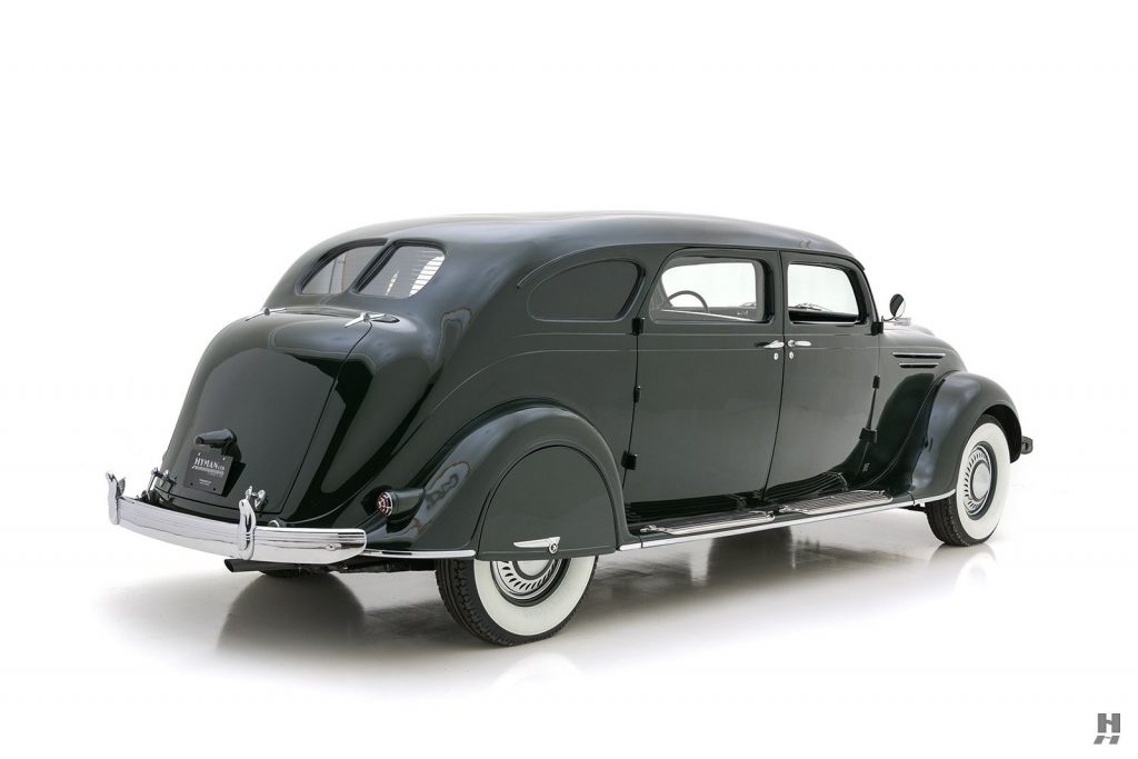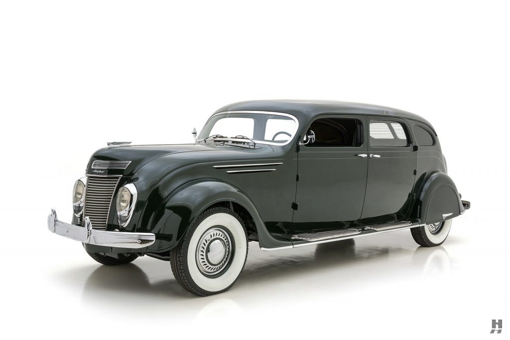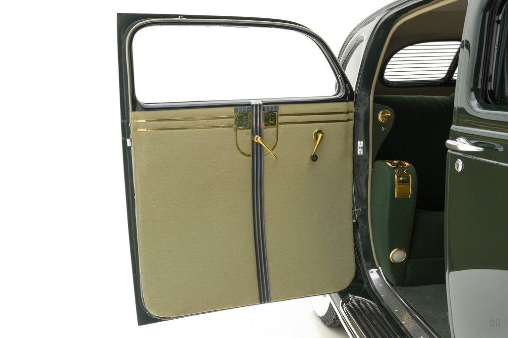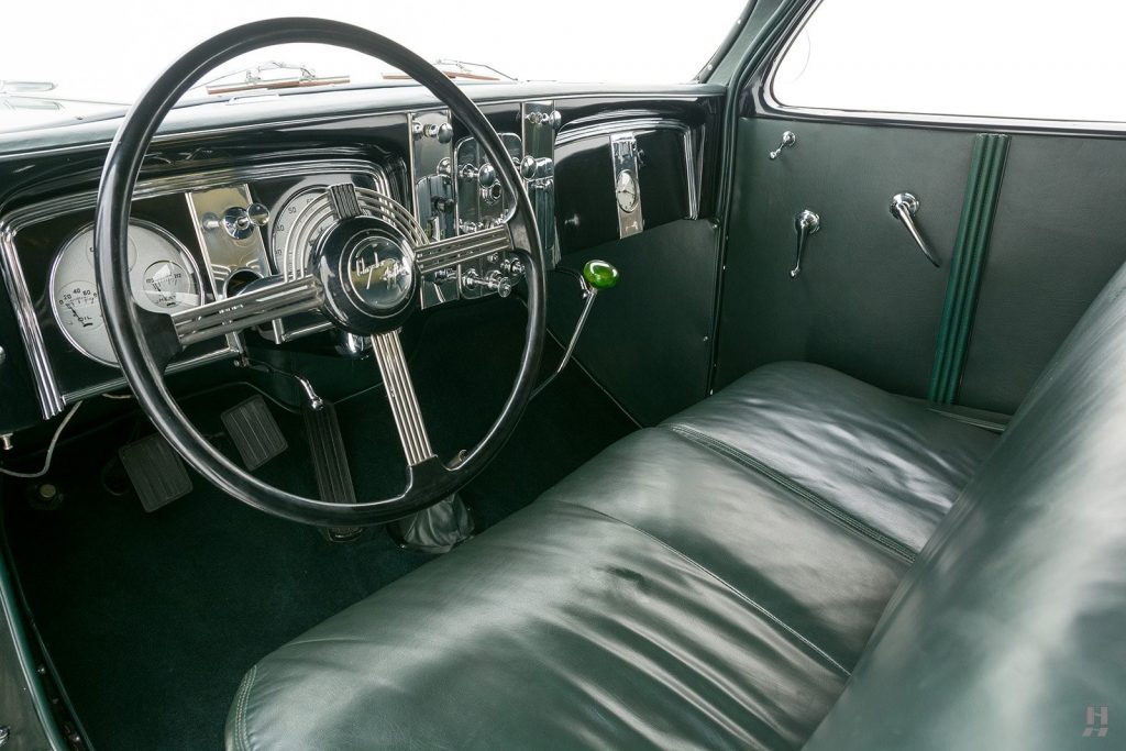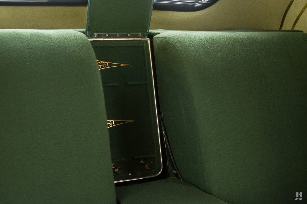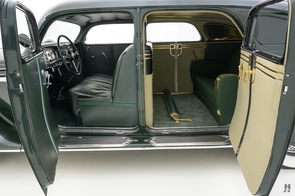 : 1937, CW Imperial Airflow par LeBaron, 1/3, vitres de custode arrières obturées, séparation à commande électrique avec cocktail cabinet avec éléments en argent sterling, 2 humidificateurs, radio à l’arrière, vanity set avec prise pour rasoir, montre Jaeger, baromètre et boussole, sièges occasionnels repliables, tous éléments chromés plaqués or, éléments décoratifs en jade dans les garnitures de portes, garnitures et éclairage de style Art Déco, accoudoir central arrière contenant une tablette, stores sur la lunette arrière, repose pied contenant un parapluie et une canne, Brewster Green, cuir vert avant/tissu de laine Laidlaw Brewster Green.
