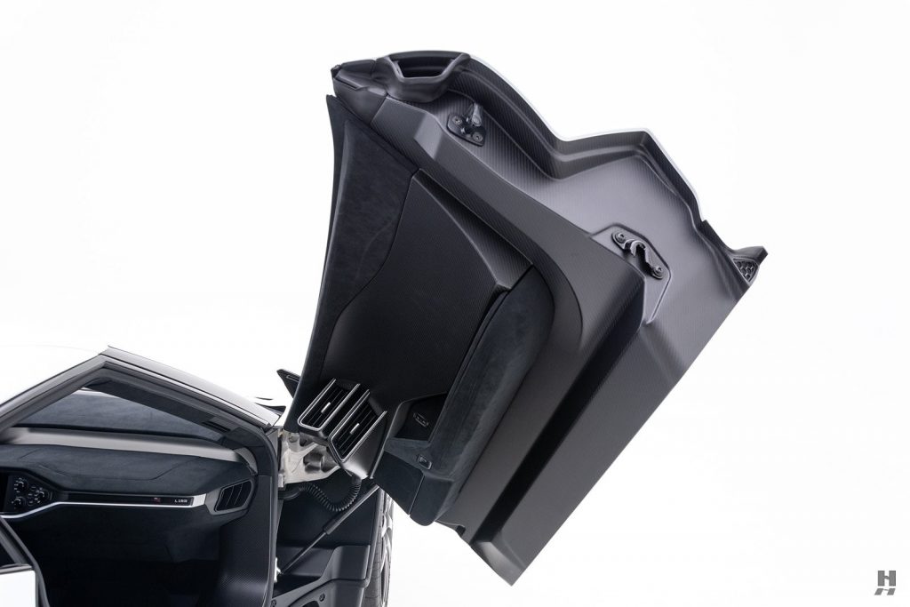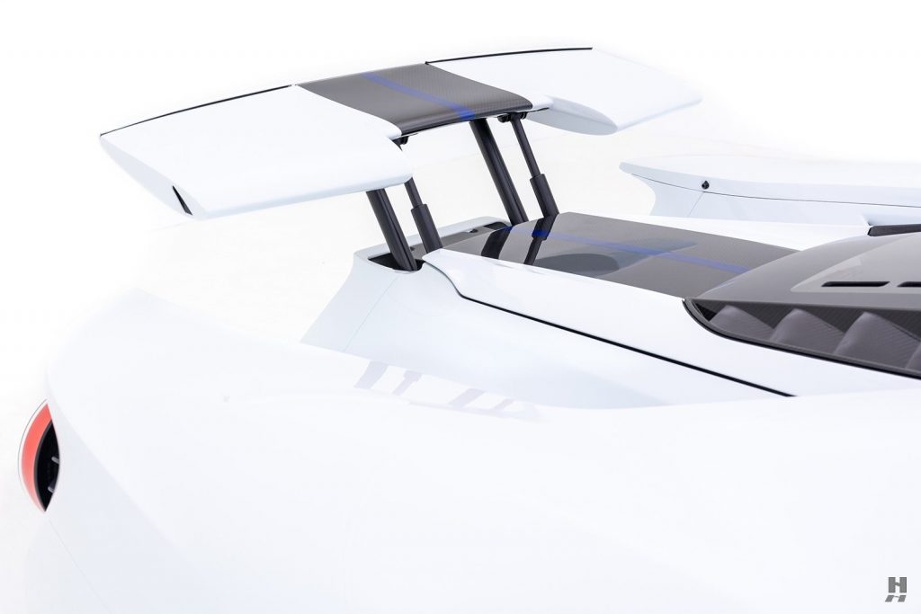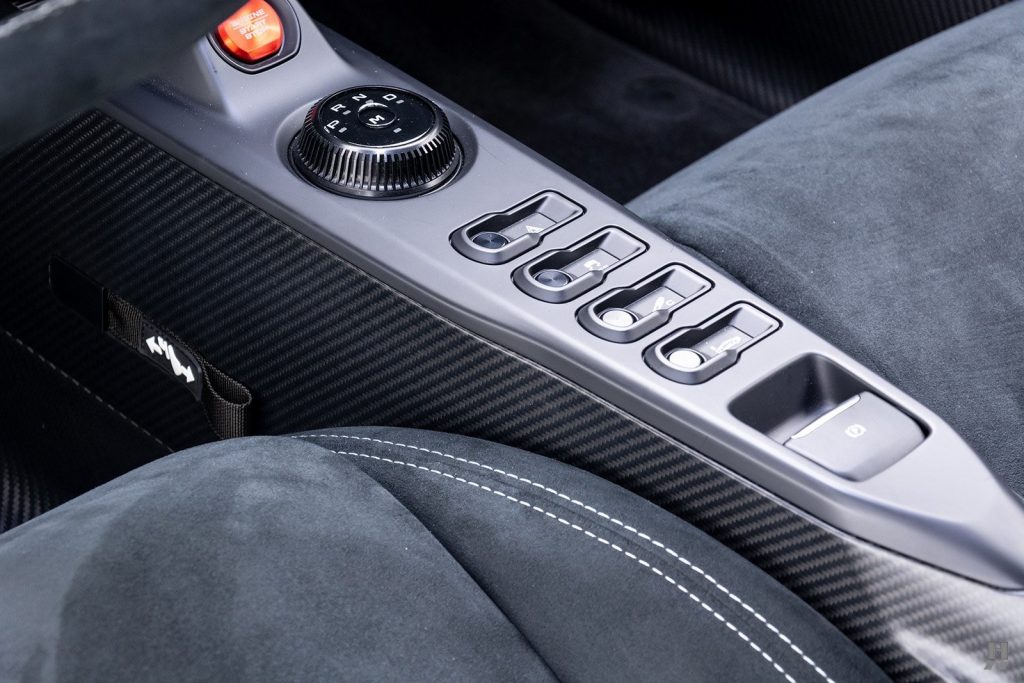 Jantes 20″, diffuseur avant, bas de caisses, rétroviseurs extérieurs, diffuseur arrière et ouïes de capot en carbone. Etriers de freins Brembo laqués noirs avec scripts argent.