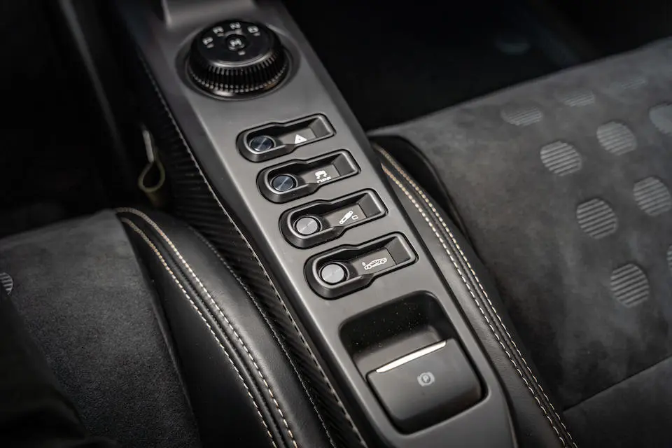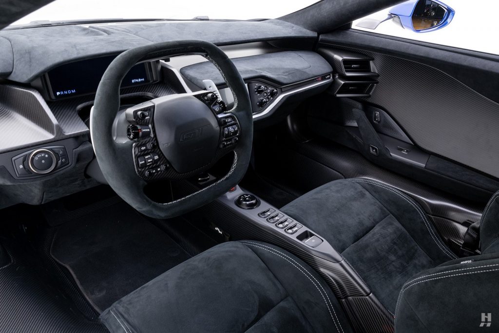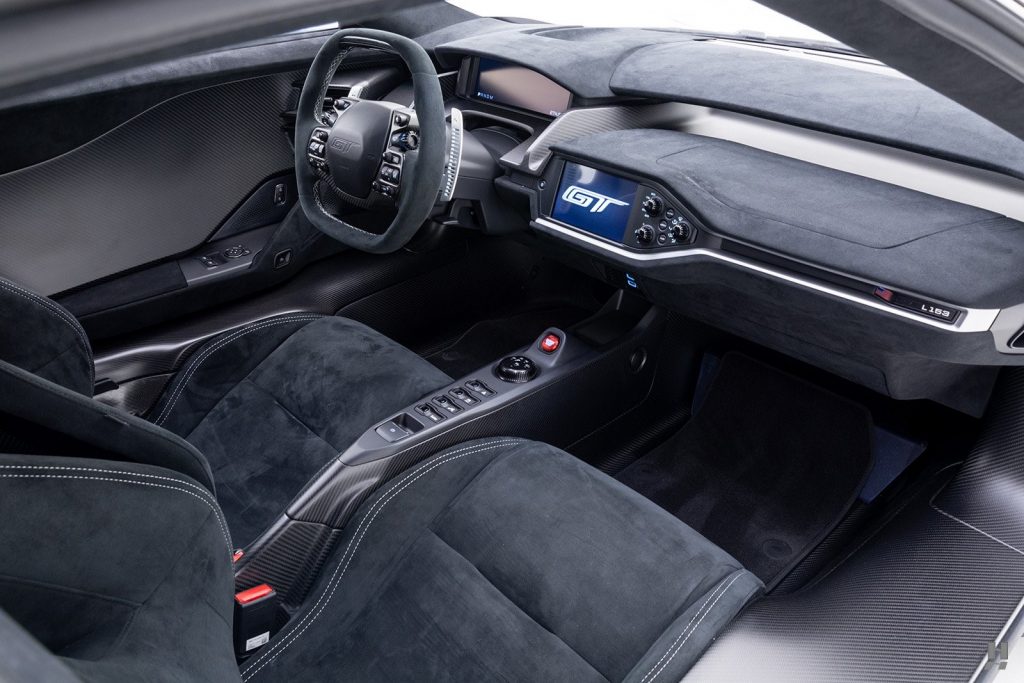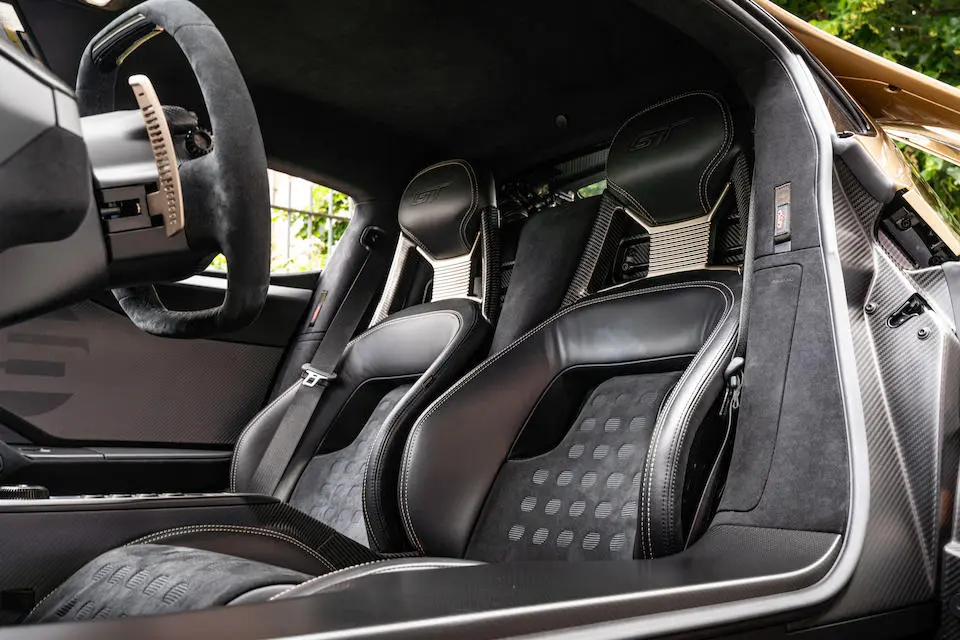 Habitacle avec seuils de portes, console et coque des sièges baquet en carbone, garnitures en alcantara noir (sièges, volant) avec inserts or. Palettes de changement de vitesses dorés.