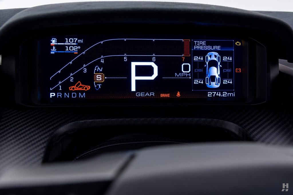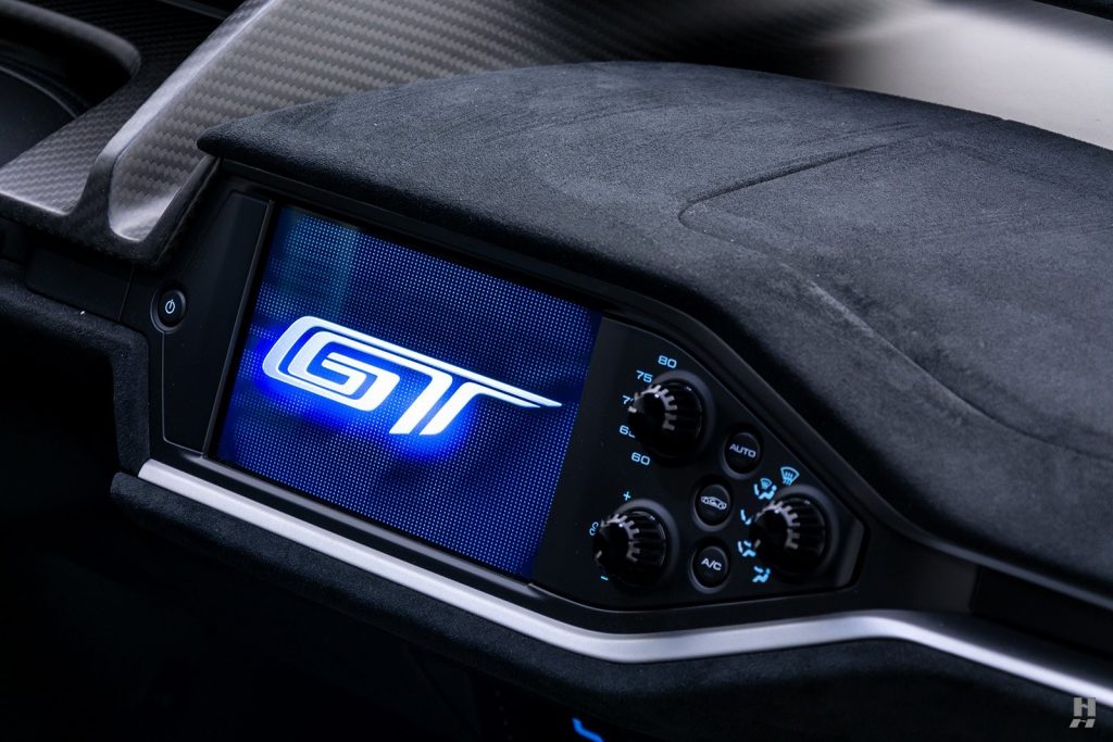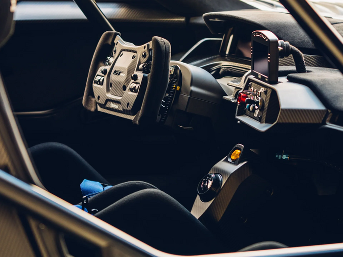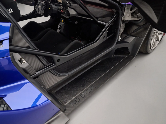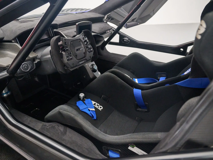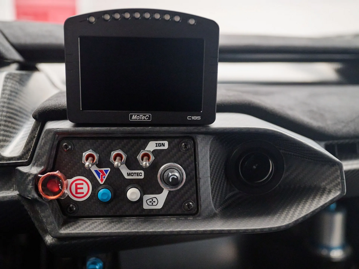 L’habitacle strictement biplace reçoit des sièges baquets fixes avec un pédalier et une colonne de direction réglables. Pare-brise réalisé en Gorilla Glass (utilisé pour les écrans de téléphone portable) fabriqué par Corning (USA) plus fin et plus léger que les éléments en verre feuilleté.