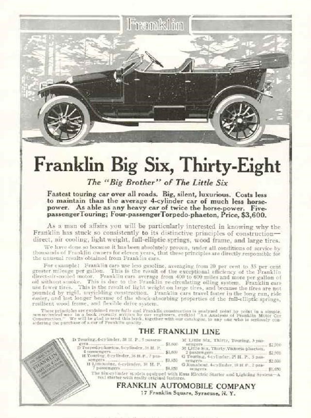 Les Franklin connaissent un succès considérable grâce à ce type de refroidissement plus efficace que le refroidissement liquide (l’antigel n’est pas encore inventé) qui leur permettent d’être utilisées par tous temps.