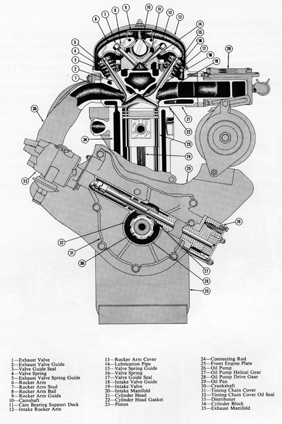 Distribution semi-culbutée « F head » avec soupapes d’admission en tête positionnées dans la culasse, actionnées par des basculeurs inversant le mouvement des tiges de guidage pour une ouverture vers le bas dans la chambre de combustion. Les soupapes d’échappement sont en position latérale dans le bloc moteur s’ouvrant elles vers le haut et sont actionnées directement par l’arbre à cames.