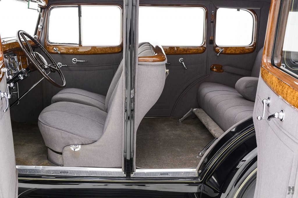 7 Passenger Sedan Limousine style 335 : Limousine 4 portes, 7 places avec 2 sièges occasionnels repliables, garniture cuir à l’avant et drap de laine à l’arrière, séparation et intercom, colonne de direction 37°49,