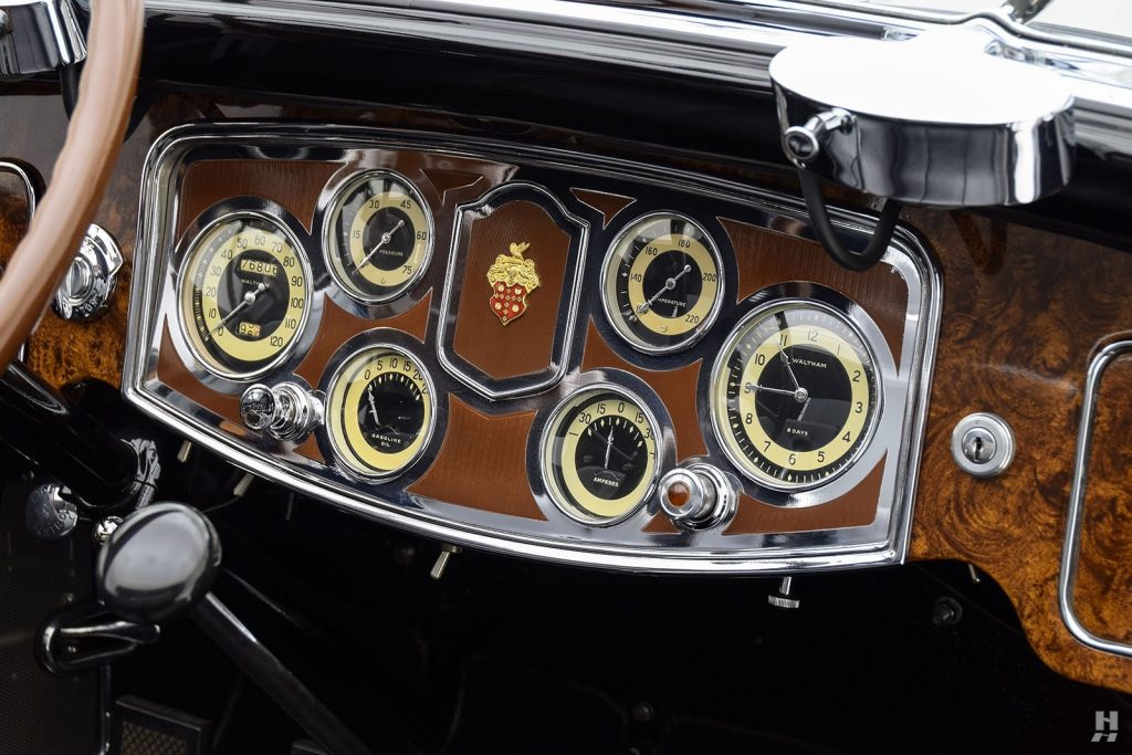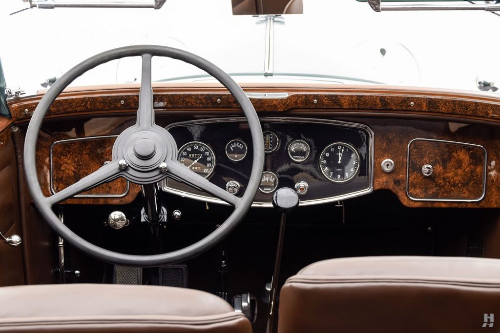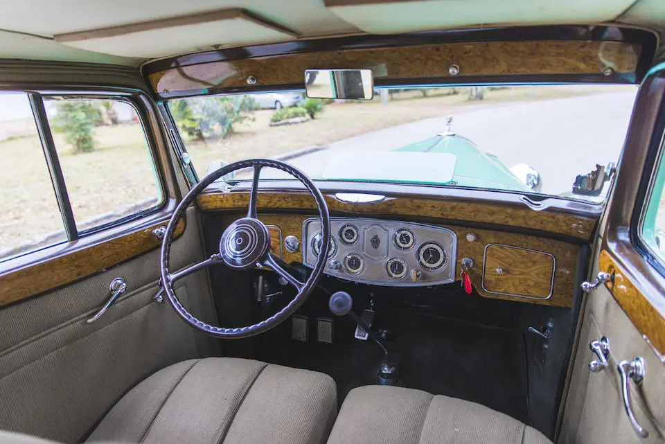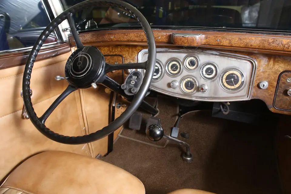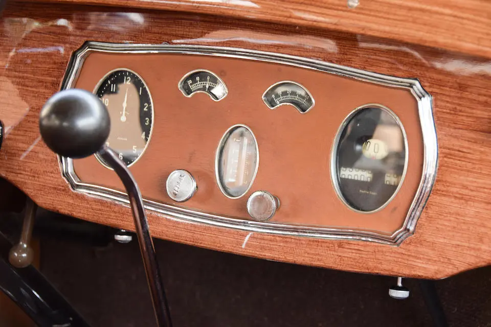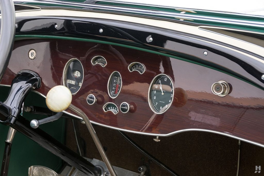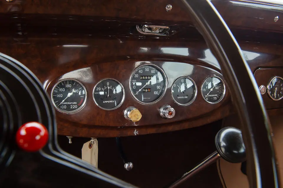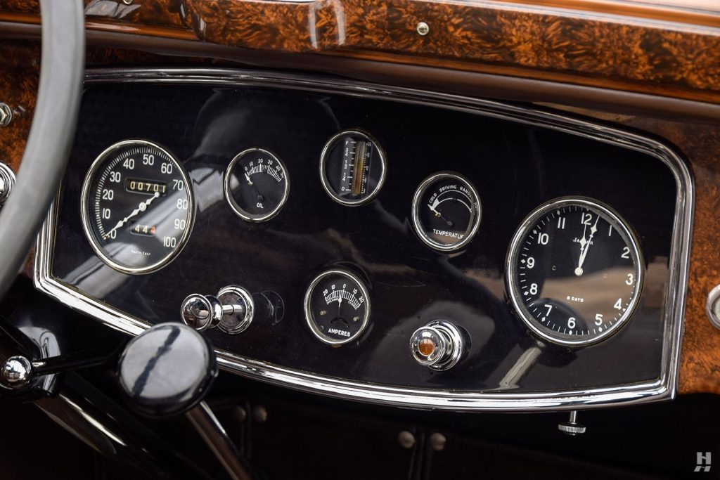 Tableau de bord redessiné en noyer verni avec rhéostat d’éclairage. Indicateur de température d’eau au tableau de bord en place du Moto-Meter, rétroviseur intérieur et essuie-glaces .