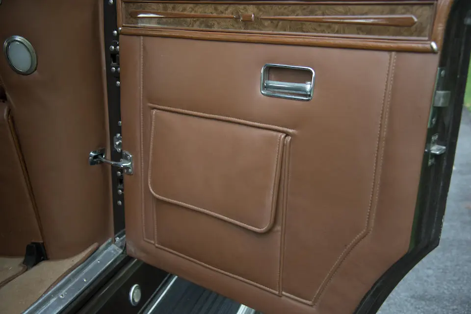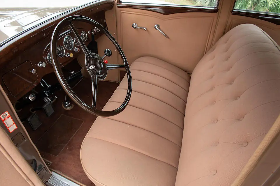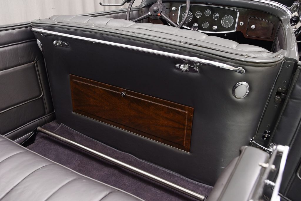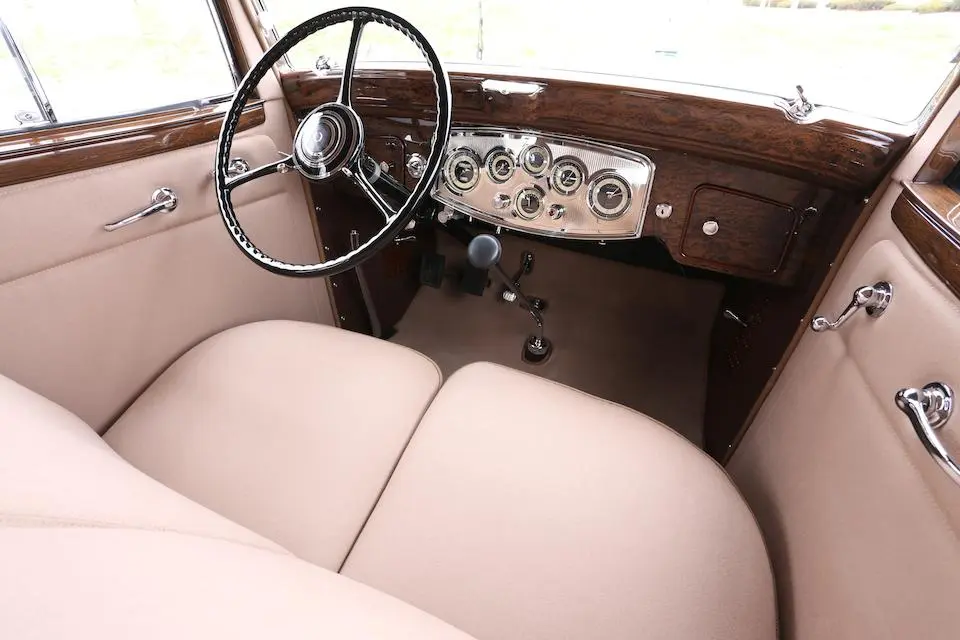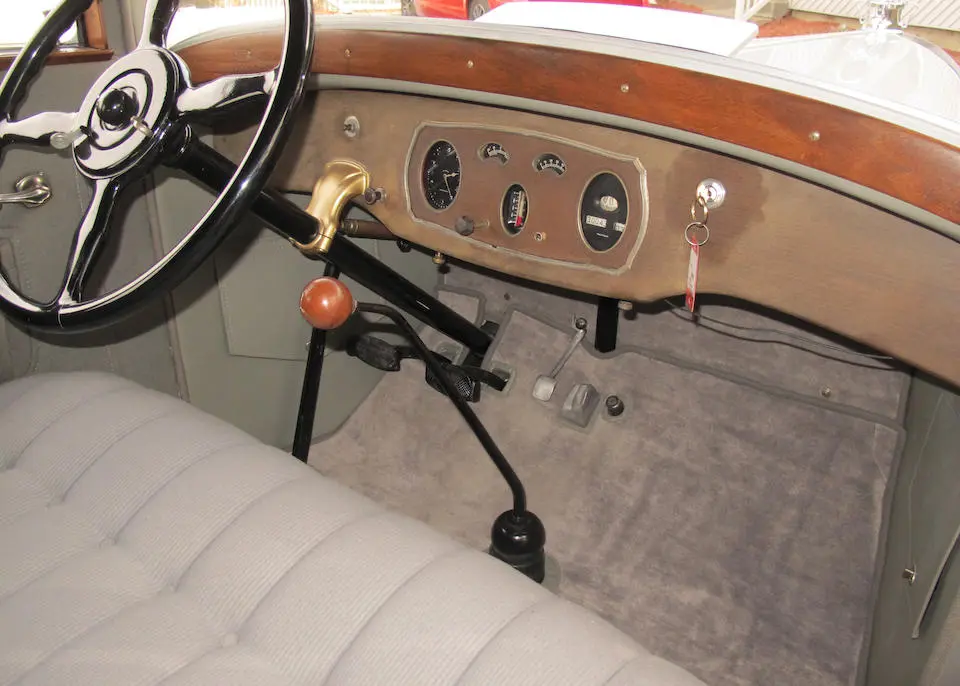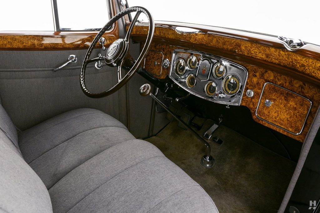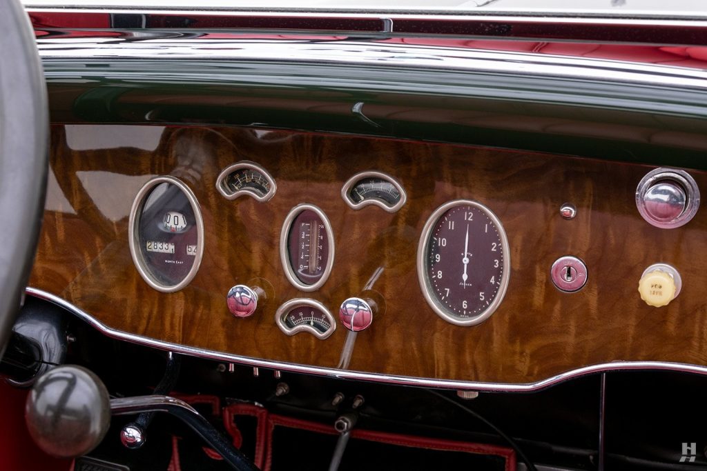Tableau de bord redessiné en noyer verni avec rhéostat d’éclairage. Indicateur de température d’eau au tableau de bord en place du Moto-Meter, rétroviseur intérieur et essuie-glaces .