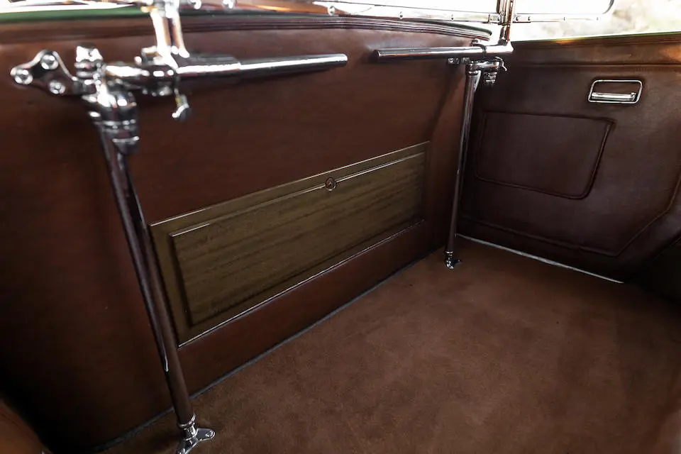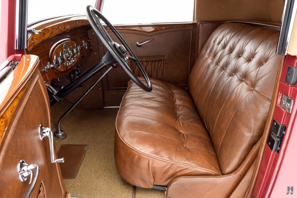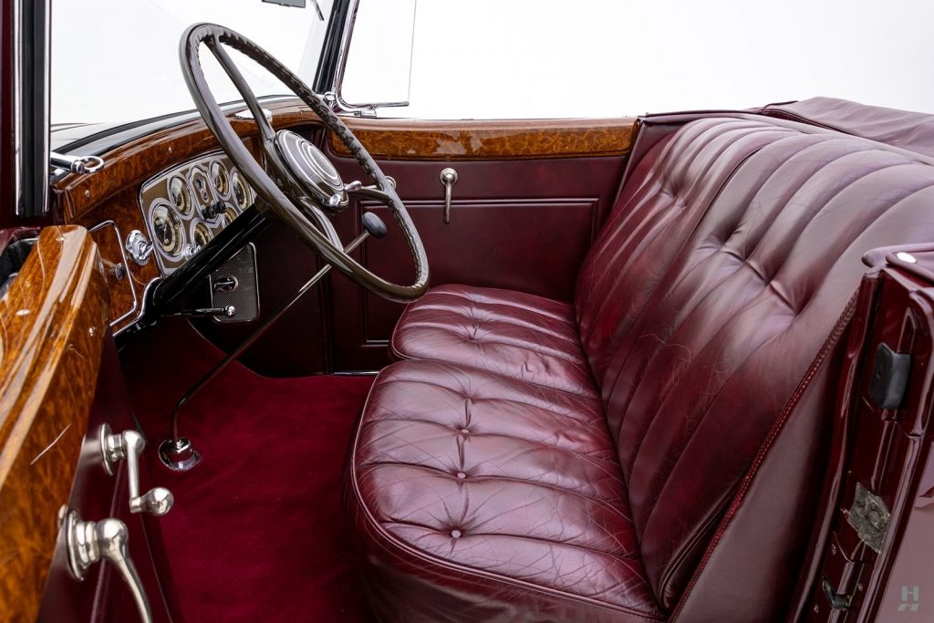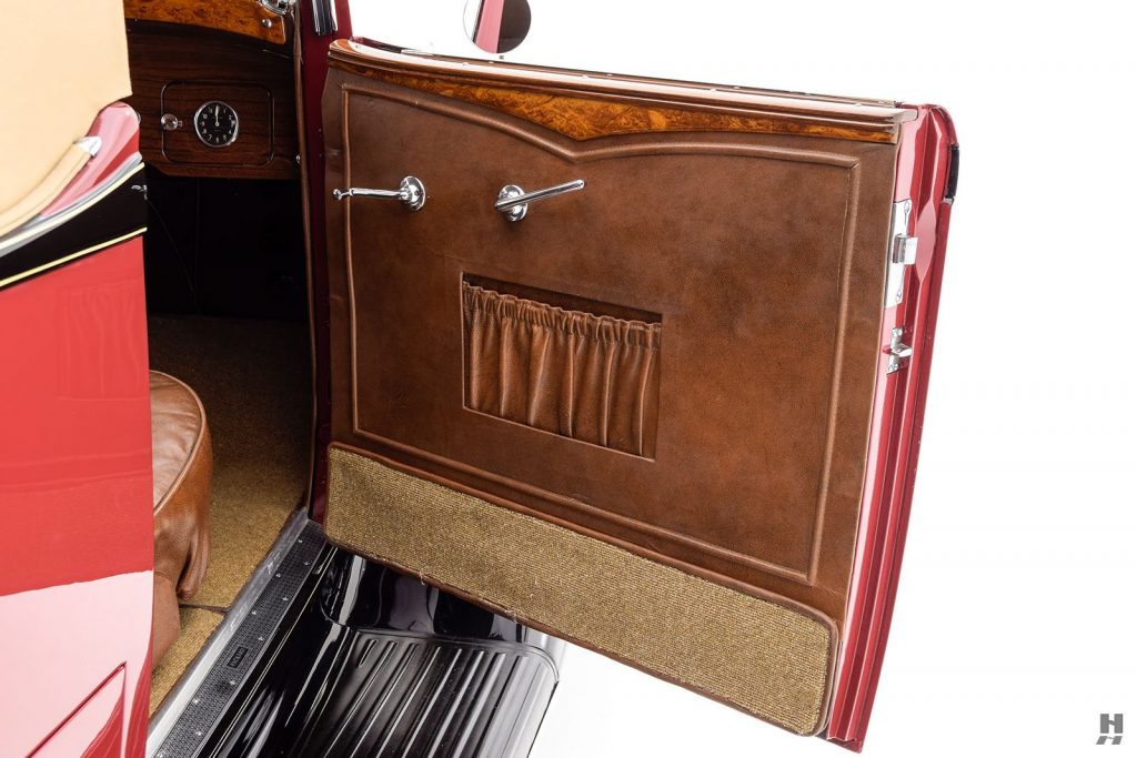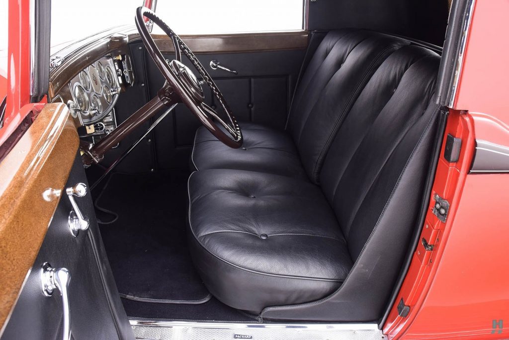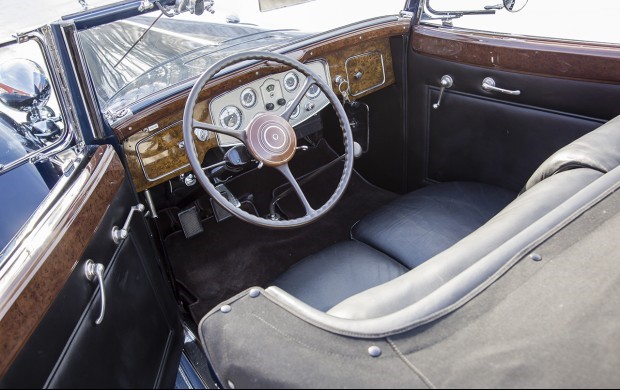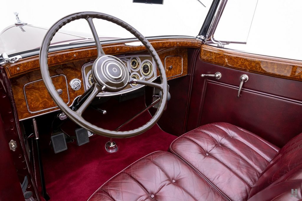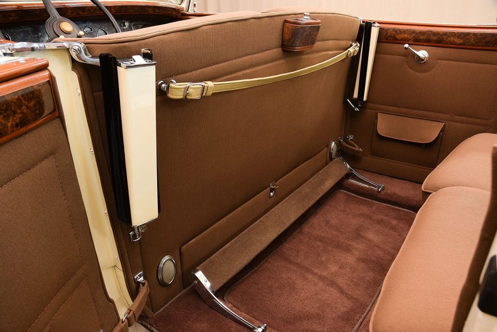 Tableau de bord redessiné en noyer verni avec rhéostat d’éclairage. Indicateur de température d’eau au tableau de bord en place du Moto-Meter, rétroviseur intérieur et essuie-glaces .