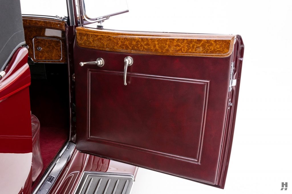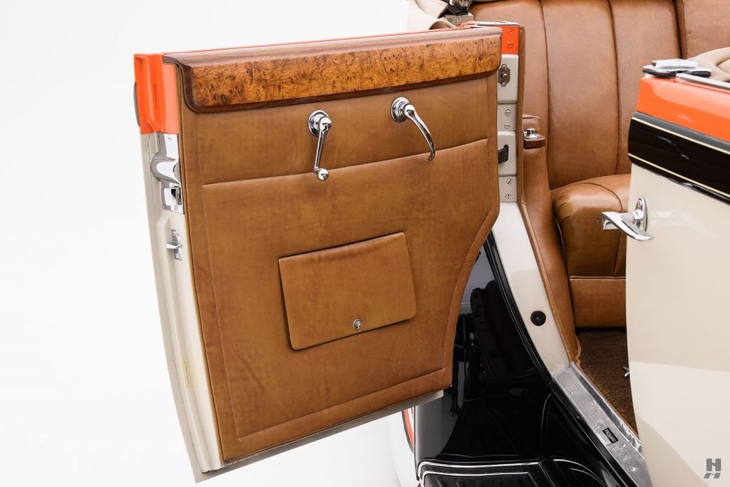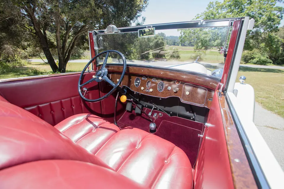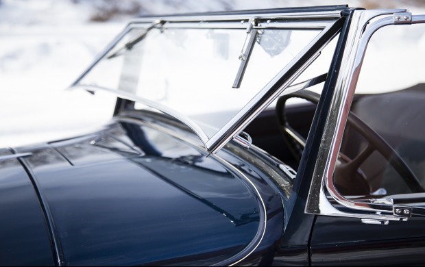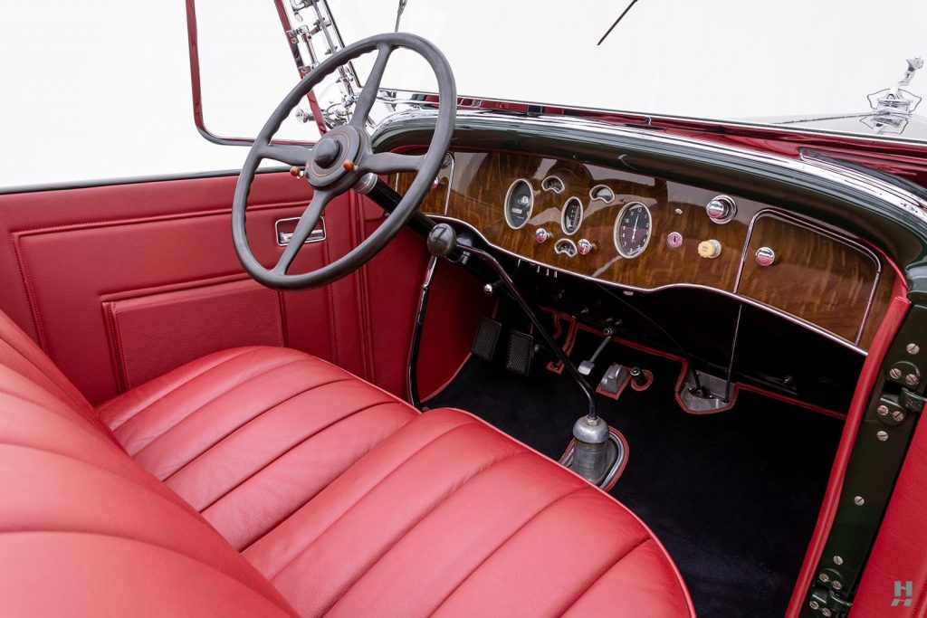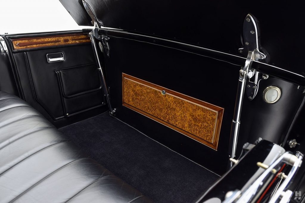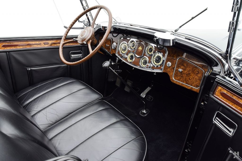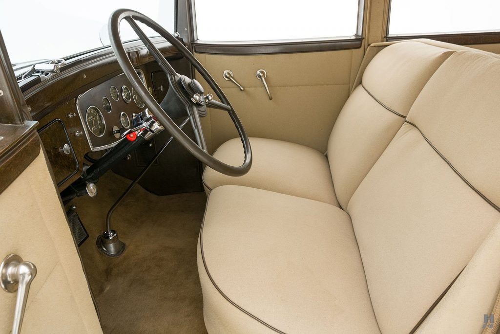 Tableau de bord redessiné en noyer verni avec rhéostat d’éclairage. Indicateur de température d’eau au tableau de bord en place du Moto-Meter, rétroviseur intérieur et essuie-glaces .