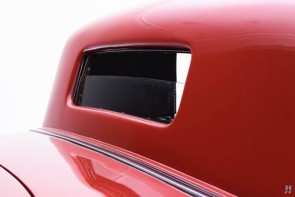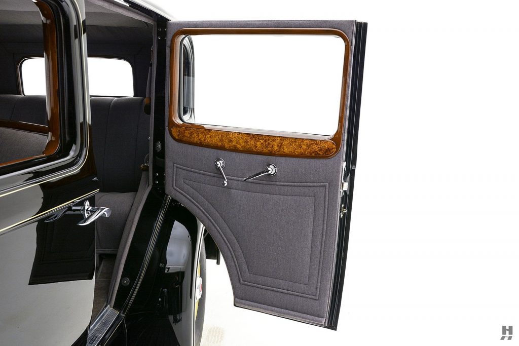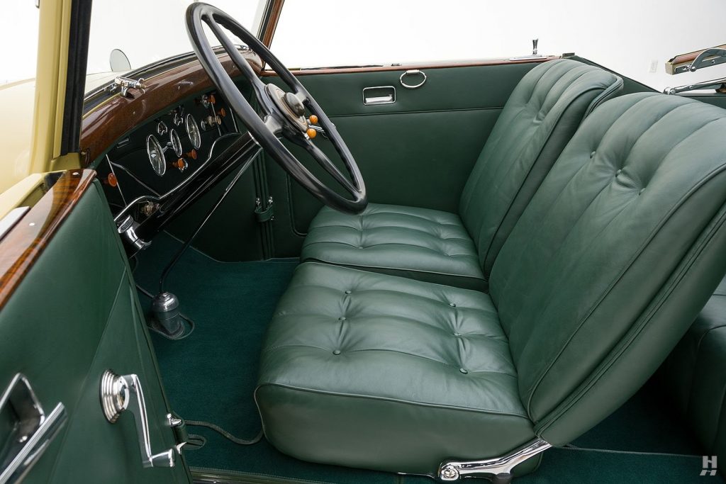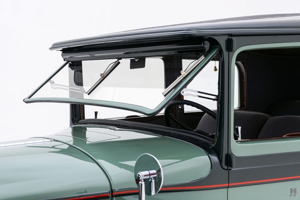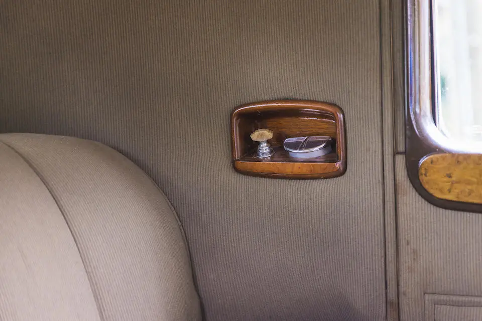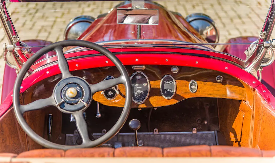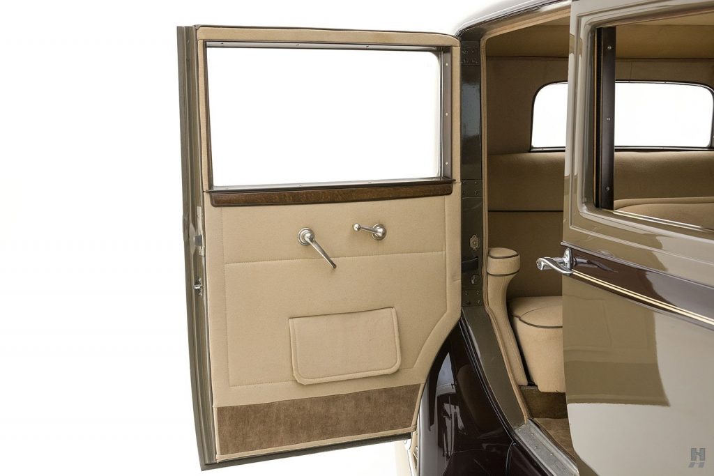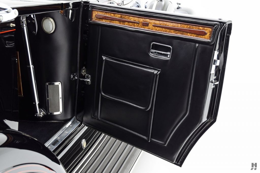 Tableau de bord redessiné en noyer verni avec rhéostat d’éclairage. Indicateur de température d’eau au tableau de bord en place du Moto-Meter, rétroviseur intérieur et essuie-glaces .