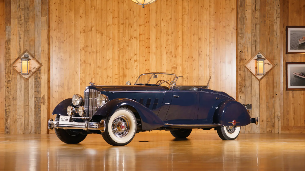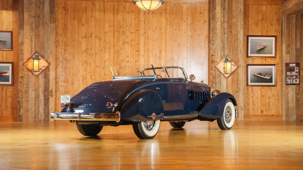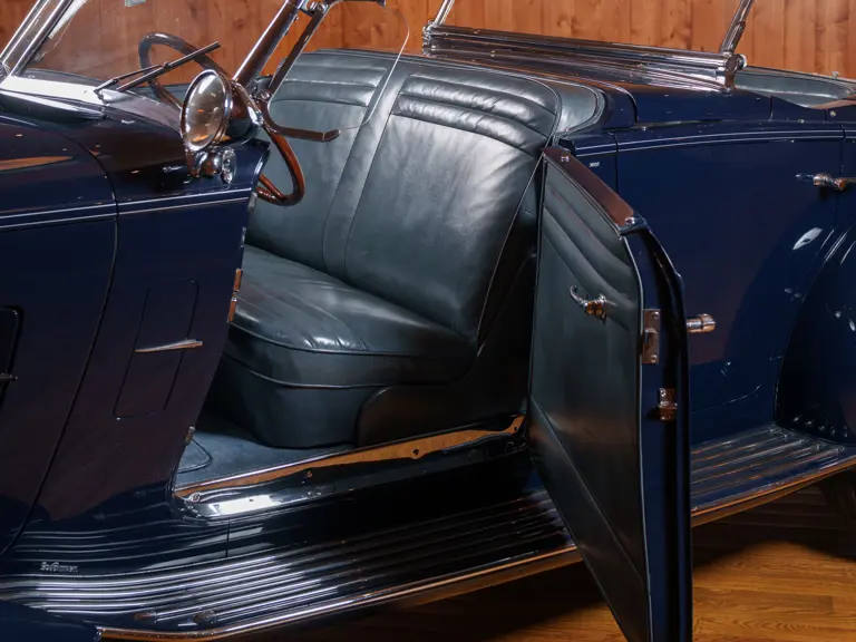 Individual Custom Sport Phaéton par LeBaron (dessin Alexis de Sakhnoffsky), Torpédo 4 portes profilé, capot rallongé jusqu’à la paroi pare-feu, ailes ponton ovoïdes, marchepieds flottants, capote entièrement escamotable et arrière fastback. 5 exemplaires fabriqués (prix double de la version de base de la Twelve).