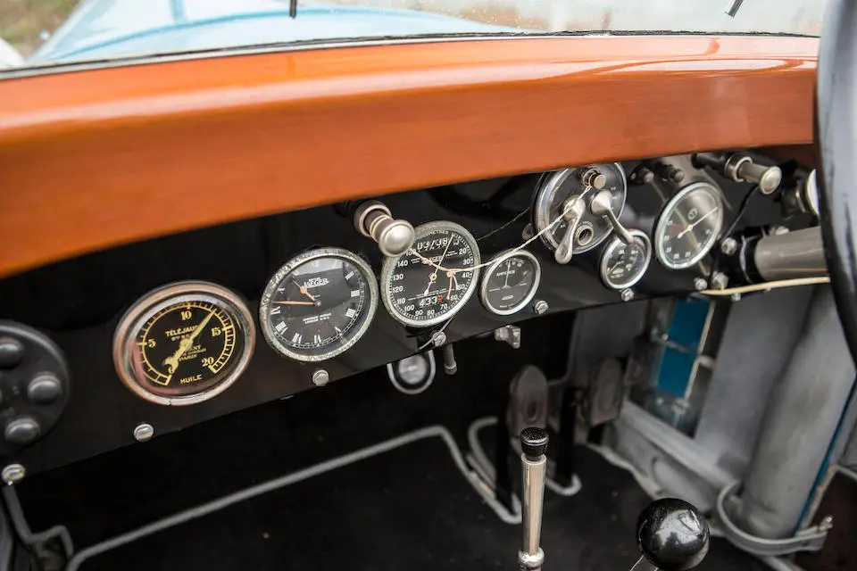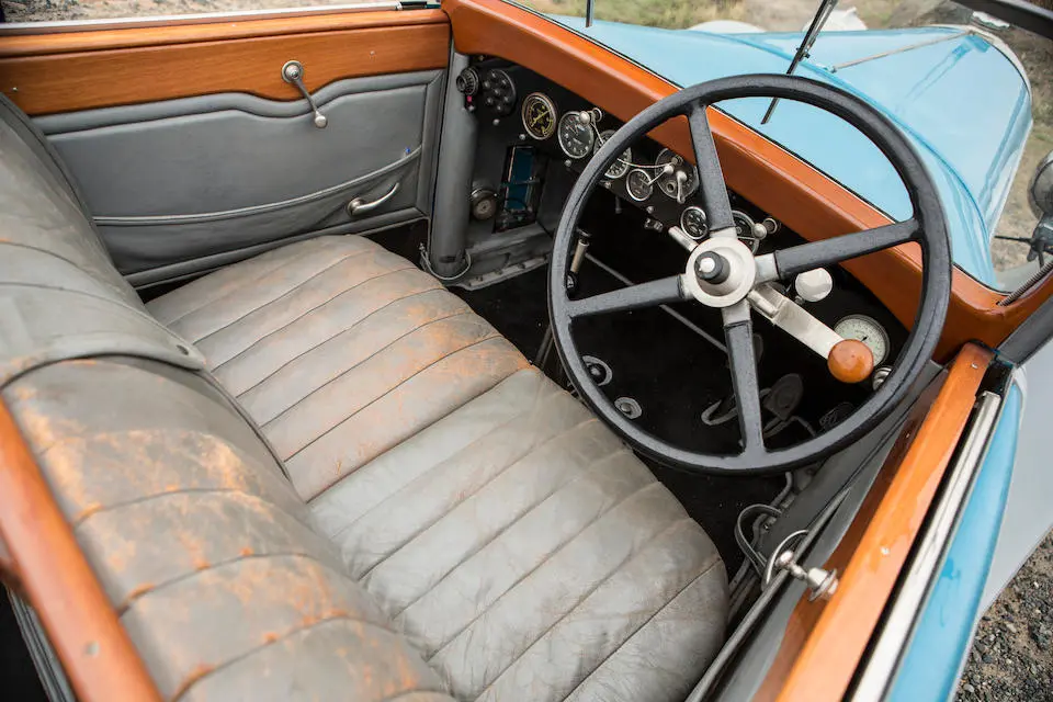 26915 : 1928, C11, Berline 4 portes par Achard & Fontanel, double roue de secours, servofrein, relai démultiplicateur sur la transmission à commande par dépression du moteur, flasques de roues aluminium, 2 tons bleus, filet blanc, toit simili, cuir pécari.