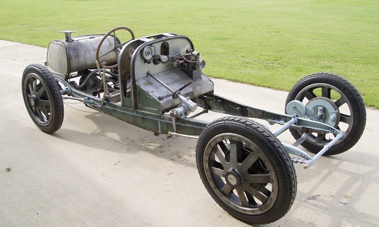 Carrosserie inspirée de la Fiat 805 Grand Prix. Cockpit avec deux traverses de châssis et 1 traverse guidant le frein à main agissant sur les 4 roues comme le frein à pied.