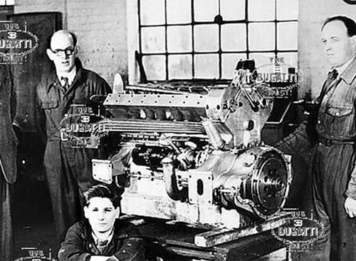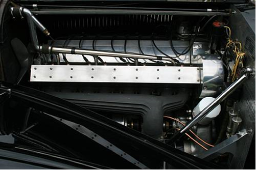 Moteur avec pistons haute compression, vilebrequin allégé et carburateur spécial inspiré des Stromberg, Lubrification par carter sec avec pompes d’aspirations et de refoulement pour abaisser le moteur sur le châssis. 175 chevaux à 5200 tours.