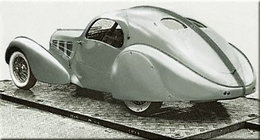 10/1935 : Salon de Paris (FRA) : Présentation de l’Aérolithe. Dessin Jean Bugatti privilégiant la légèreté, carrosserie berlinette en alliage d’aluminium et de magnésium (electron). Devant les difficultés pour souder cet alliage, on a recours à un assemblage par rivets apparents formant une arête centrale jouant le rôle d’axe de symétrie entre la partie droite et gauche.