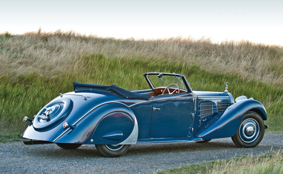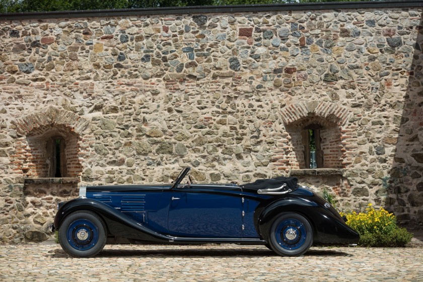 57.126 : 1935, Cabriolet Stelvio, ligne de caisse droite, baguettes chromées sur les ailes avant et arrière.