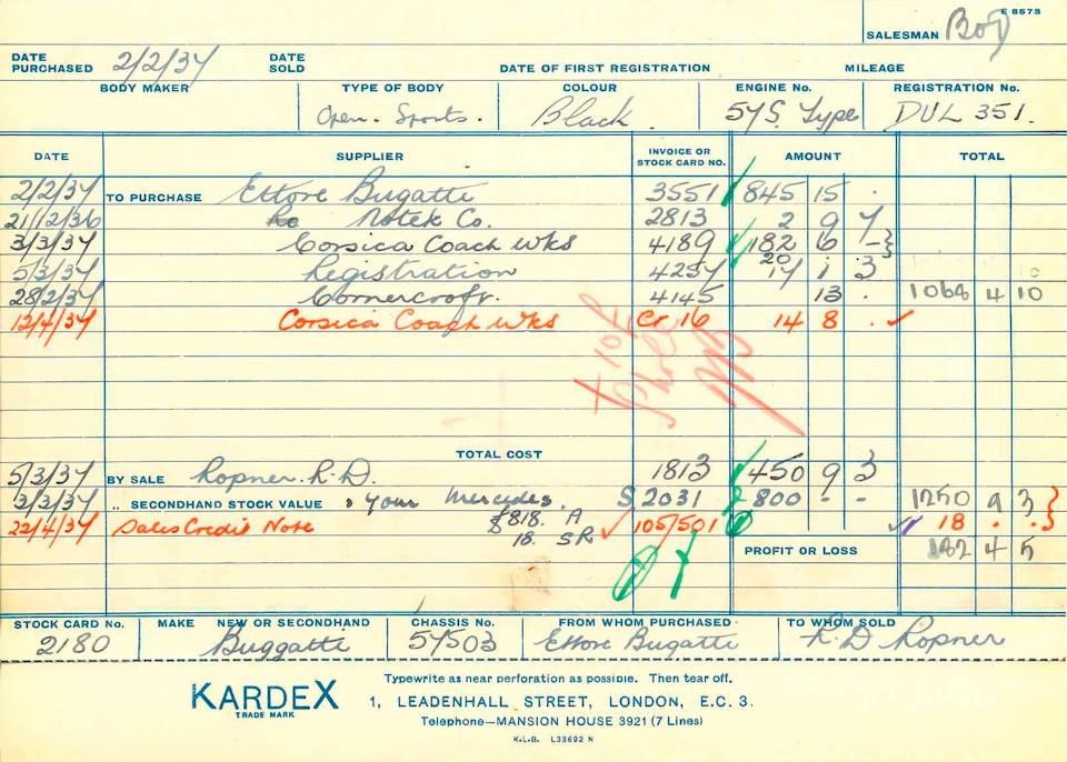 Vendue Georges Groslambert, Garage Carnot, 10-18, Ave. Carnot, Besançon (FRA), FFR 108.000 (carrosserie 30.000), immatriculée à l’adresse des bureaux parisiens de Groslambert, 61, Ave. De la République, Paris (FRA), 7186 RM 7 (07/1939).
