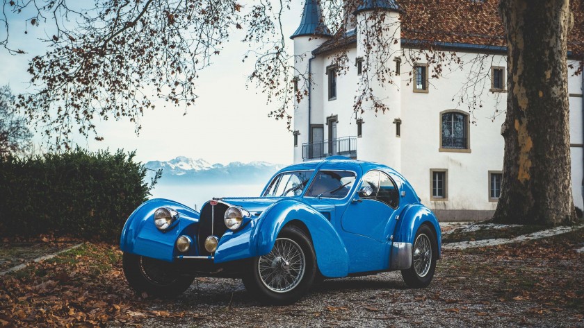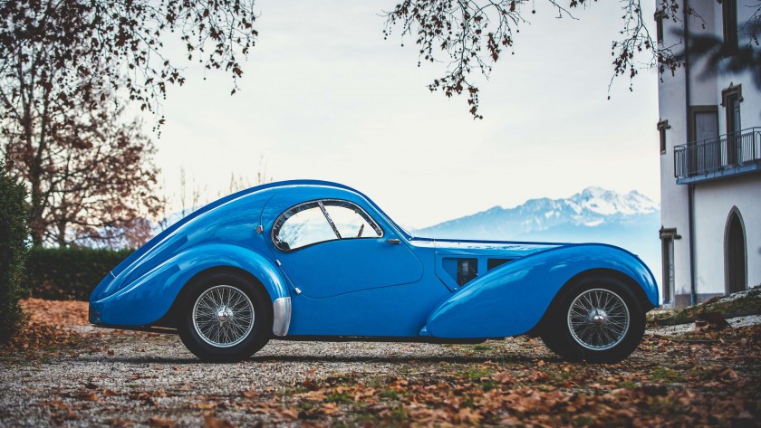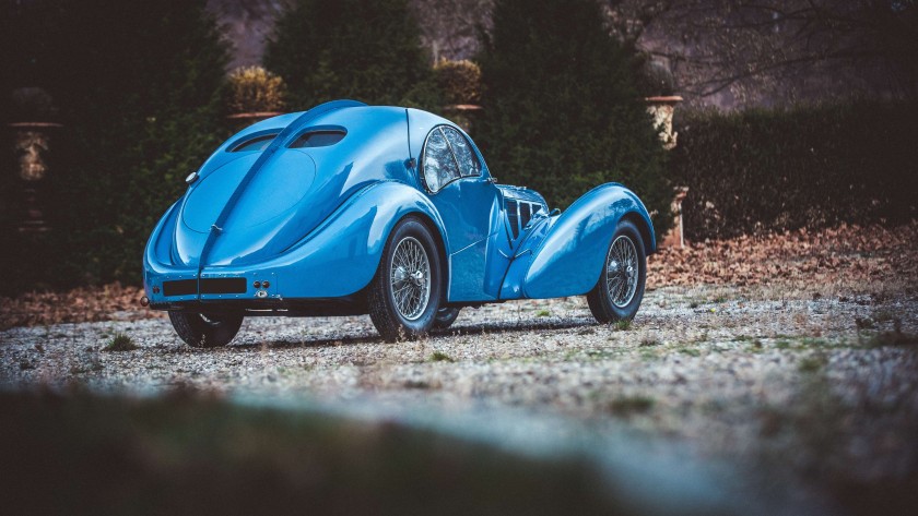 57.767 : 07/12/1937, 57C Coupé Atalante (caisse 31), 1/5 57C, 1/16 caisse alu, 1/3 caisse alu à compresseur, moteur 62C, Bleu Royal, cuir havane.