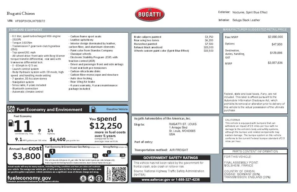 VF9SP3V32LM795246 : 2019, Chiron Sport 110 ans Bugatti, 1/20, toit transparent à 2 panneaux amovibles, jantes Nocturne noires, étriers bleu de France, coque de rétroviseurs extérieurs, partie inférieure de l’aileron mobile et goulotte d’essence tricolores, volant cuir et carbone bleus, drapeau tricolore brodé dans les appuie-têtes, carbone Steel Blue/Steel Blue mat, cuir Bleu foncé.