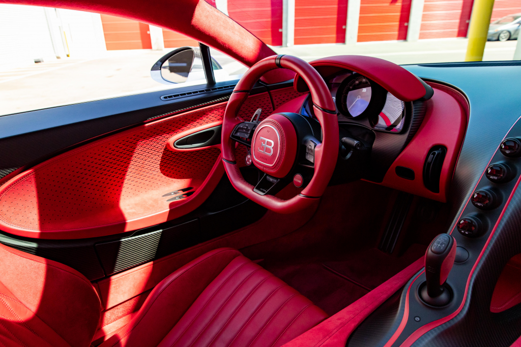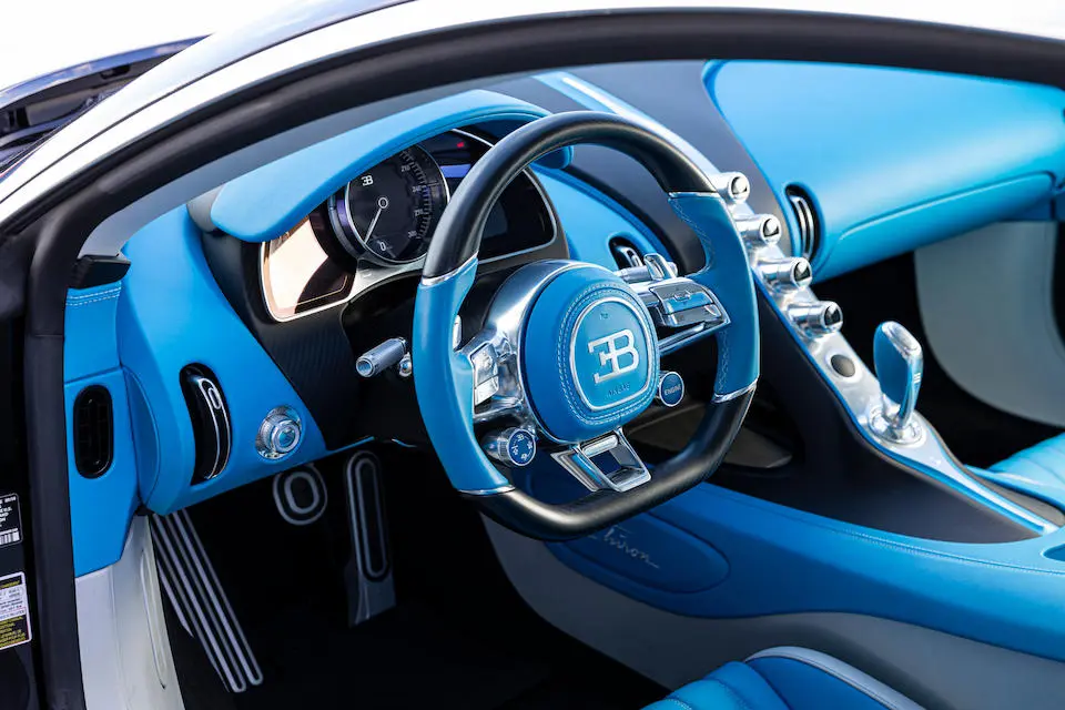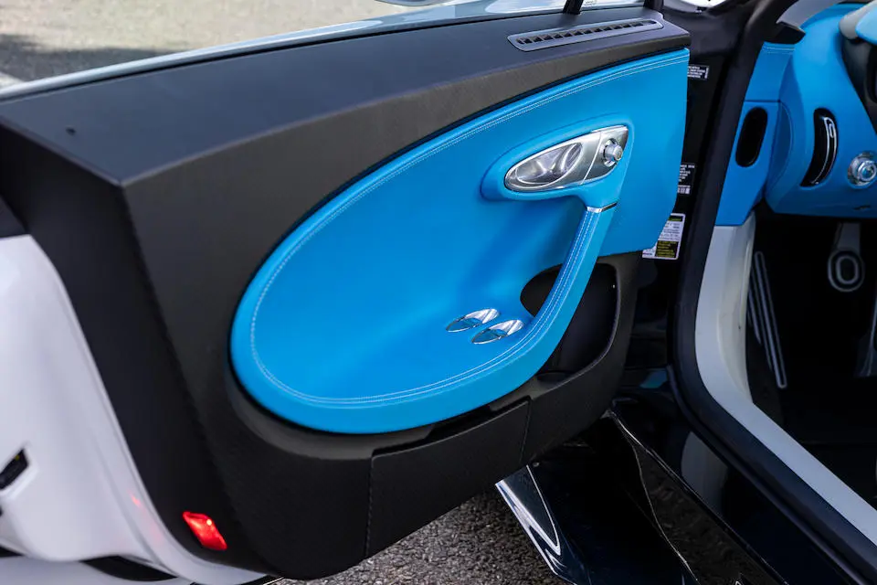 VF9SP3V34KM795148 : 2019, étriers bleus Bugatti, jeu de bagages, sièges confort, Blanc Glacier, inserts carbone turquoise et bleu Bugatti, cuir bleu clair/gris Rafale.