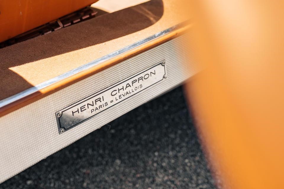 421.9414 : 1961, Cabriolet Le Caddy par Chapron (caisse 7459, livrée 04/08/1961), 10e/28, spécifications 1962, rétroviseurs extérieurs sur les ailes, radio Radiomatic, Or Longchamp (16288), cuir calf Peggy, capote noire, hardtop.
