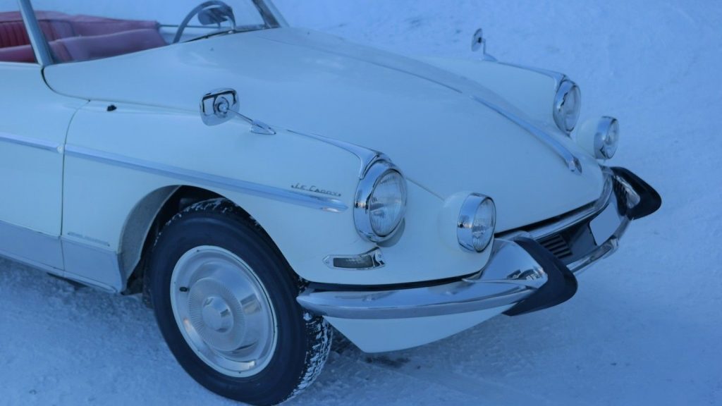 424.5419 : 1963, Cabriolet Le Caddy par Chapron (caisse 7487, livrée 23/10/1962, terminée 22/11/1962) sur châssis ID19, phares antibrouillard, autoradio Continental Edison, capote doublée drap, Blanche, cuir rouge.
