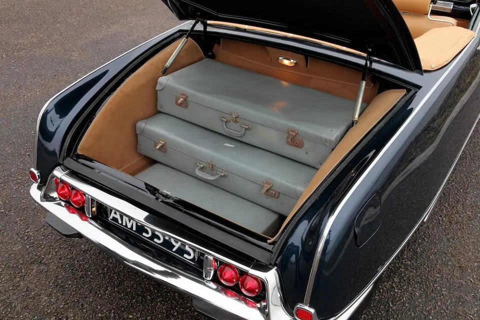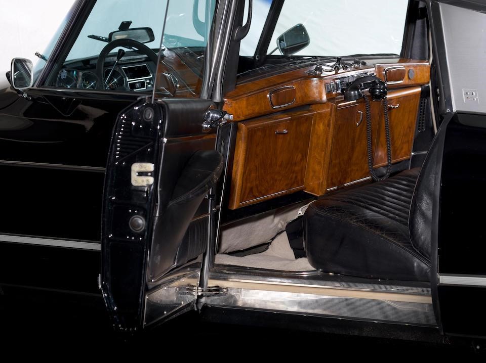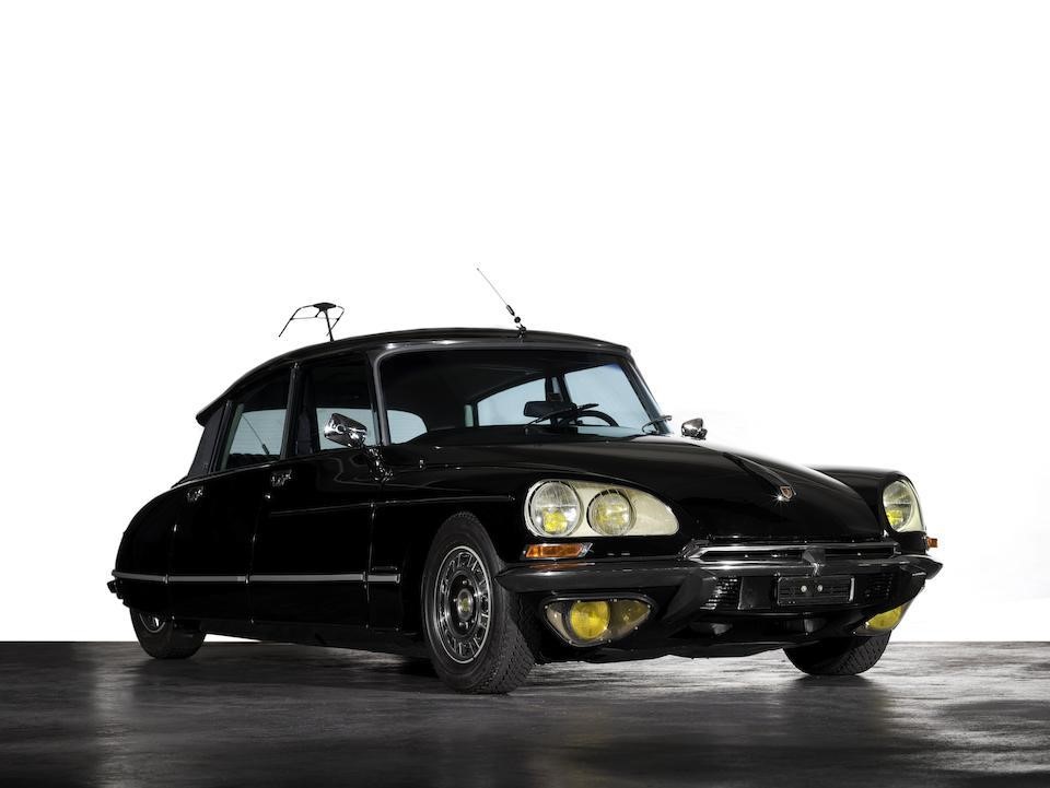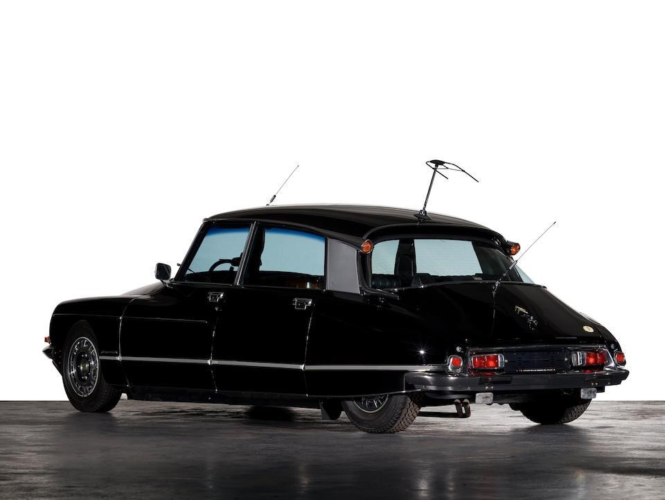 4660218 : 1972, DS 21 Prestige, modifications Chapron, phares longue portée carénés sous les pare-chocs, enjoliveurs de roues Robergel, séparation à commande électrique, boiseries arrières,, tablettes repliables, cocktail cabinet, radio stéréo arrière, radio-téléphone, antennes sur le toit et la malle, poignée de coffre spécifique, Noire, cuir noir.