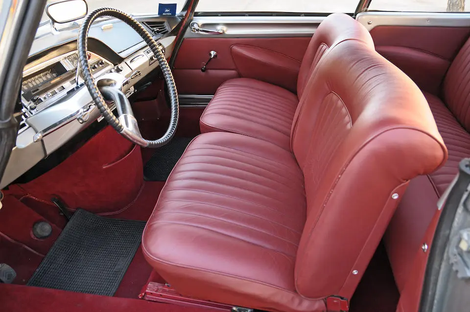 M4427162 : 1966, DS 19, Cabriolet Palm Beach par Chapron (caisse 7526, livrée 25/11/1964, terminée 12/02/1965), capote électrique, banquette avant, feux de recul, radio Radiomatic 3P8 avec antenne électrique Hirschmann, Rosso Rubino, cuir naturel.