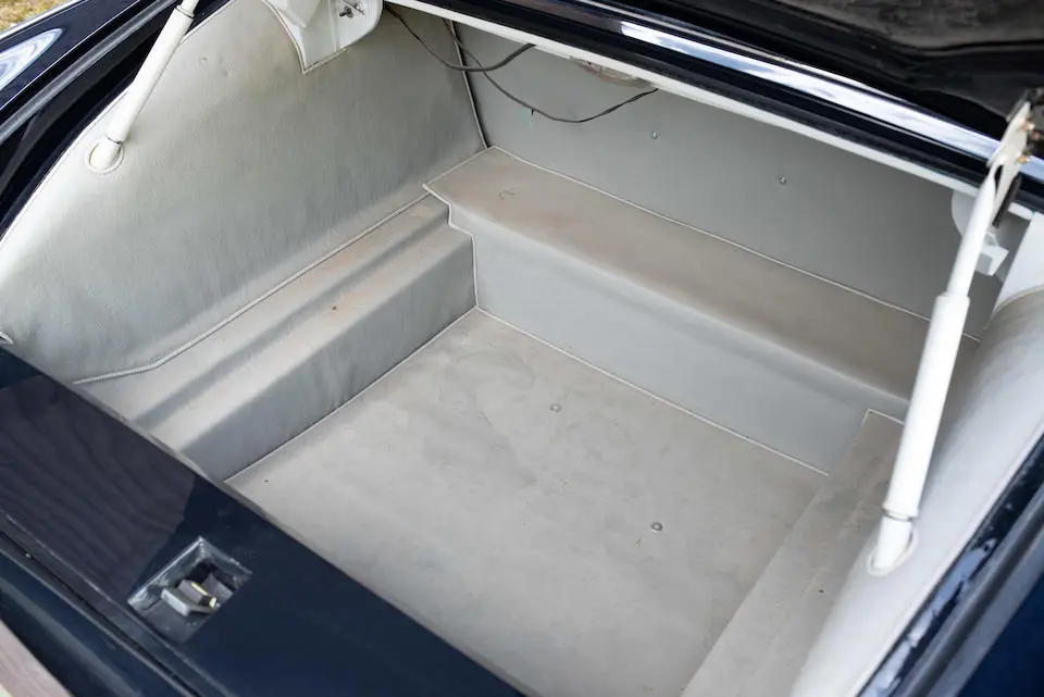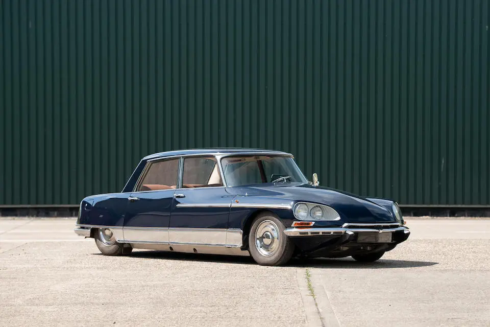 # 02FG6425 : 1975, DS 23 Injection électronique, Berline Lorraine par Chapron (caisse 7656), la seule sur châssis DS 23, séparation chauffeur à commande électrique, 2 phares antibrouillard encastrés, 2 ceintures de sécurité arrières, monogrammes MMW sur les portes arrières, chauffage séparé à l’arrière, Bleu Voiture, filets rouges, cuir.