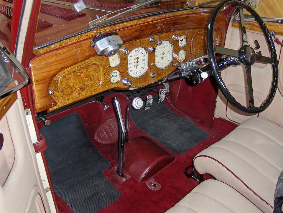 199 ? : Bordeaux/ivoire, tissu beige à passepoils rouges, moquette bordeaux, configuration 105S, 4 carburateurs Stromberg, 100 ch@4500
