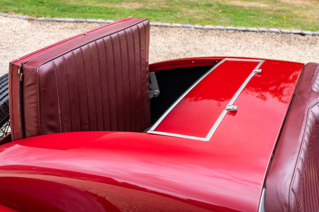 6C10814377 : 1932, 6C 1750 Gran Sport série V, Roadster (Phaéton Sport) à pare-brise rabattable par Figoni (terminée 10/1932), emblème Alfa Romeo Paris sur la calandre et notices en français avec appellation Grand en place de Gran, inscriptions droit et gauche sur les papillons de roue, amortisseurs réglables, peinture 2 tons.