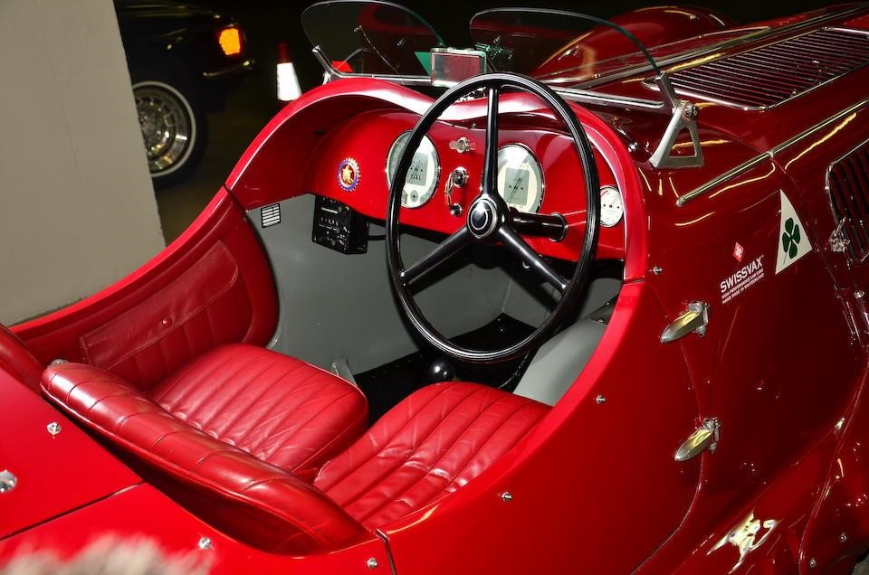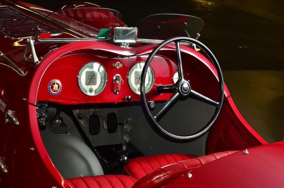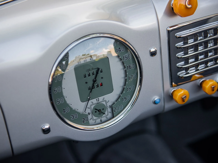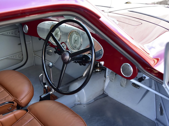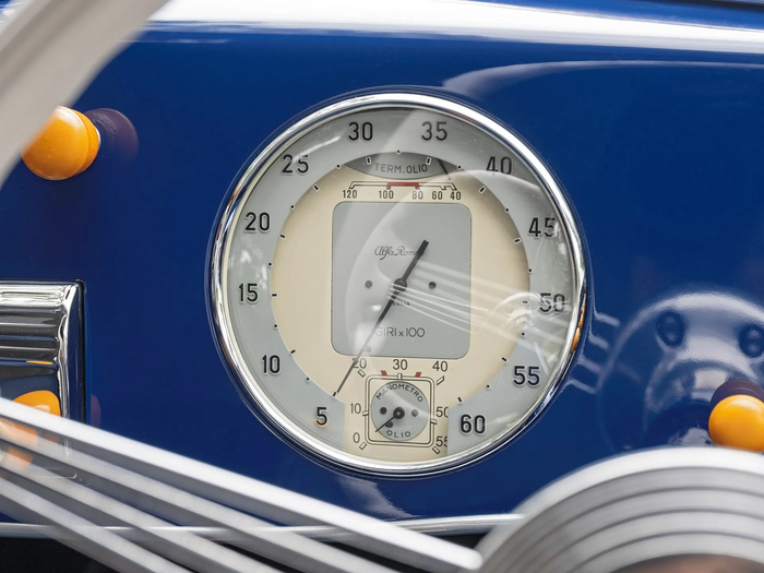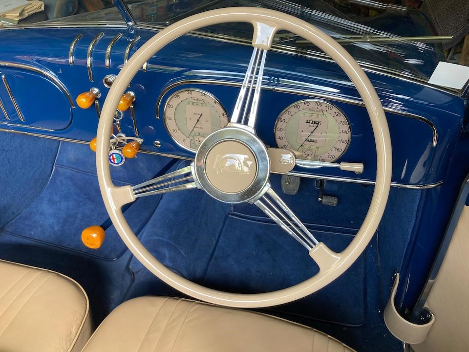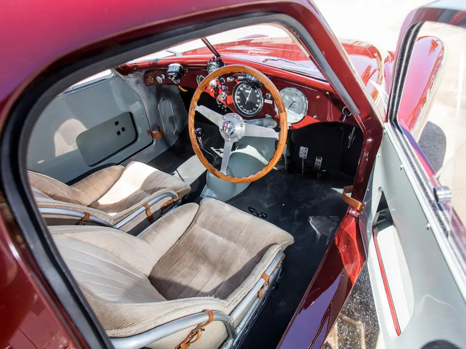 Recarrossée en 6C 2500 SS Berlinetta Competizione Touring dans sa configuration Mille Miglia 1940, nouvelles bielles acier, pistons forgés, 3 carburateurs Weber 40 DCO3, volant Bakelite, instrumentation Veglia, sièges baquets sur armature en tubes d’acier.