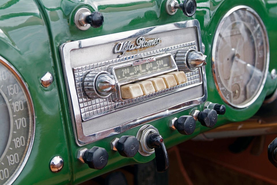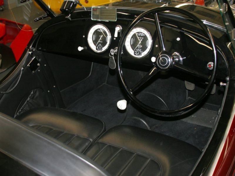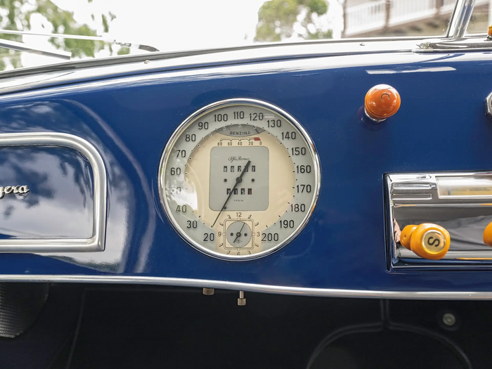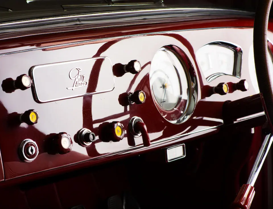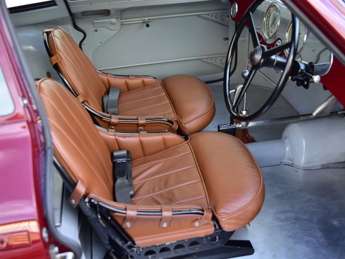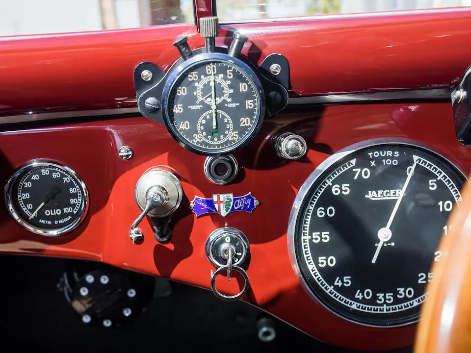 Recarrossée en 6C 2500 SS Berlinetta Competizione Touring dans sa configuration Mille Miglia 1940, nouvelles bielles acier, pistons forgés, 3 carburateurs Weber 40 DCO3, volant Bakelite, instrumentation Veglia, sièges baquets sur armature en tubes d’acier.