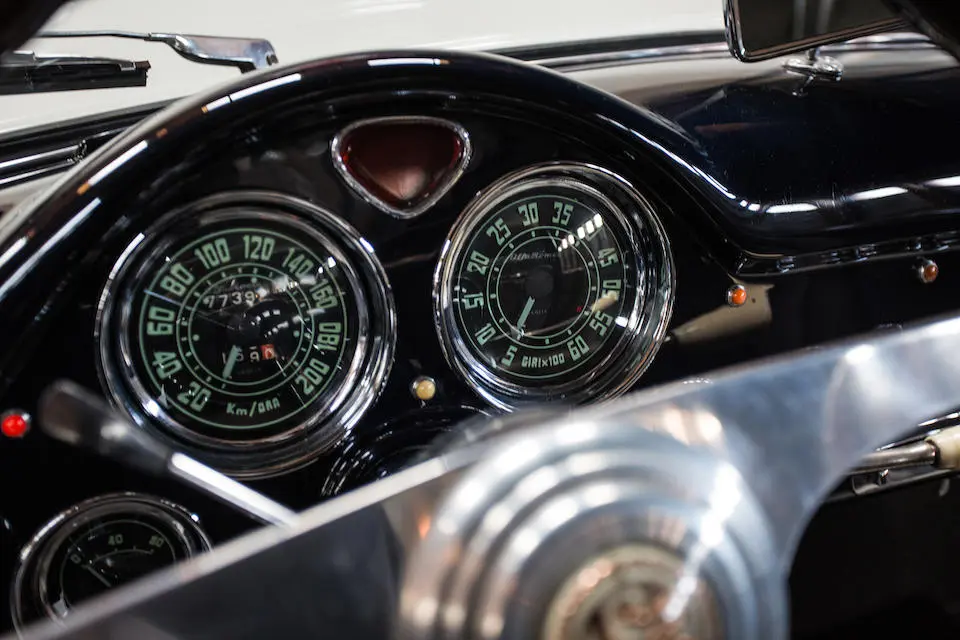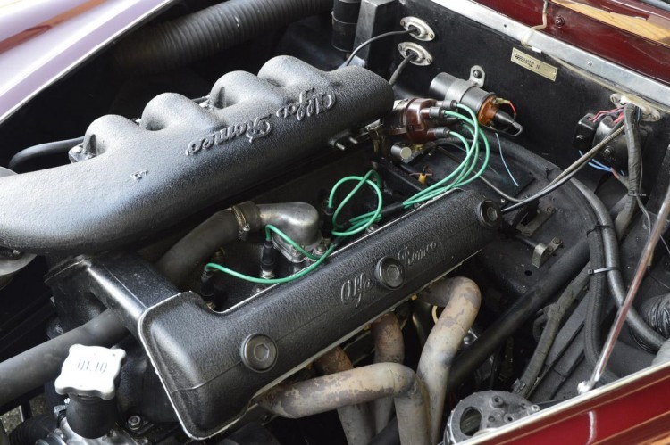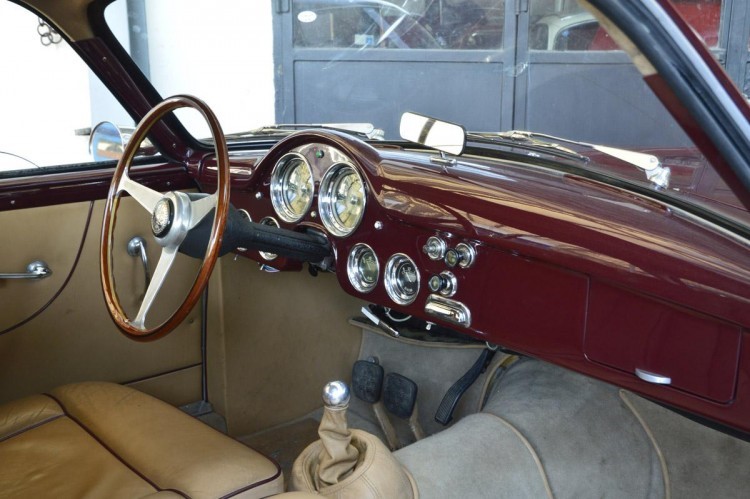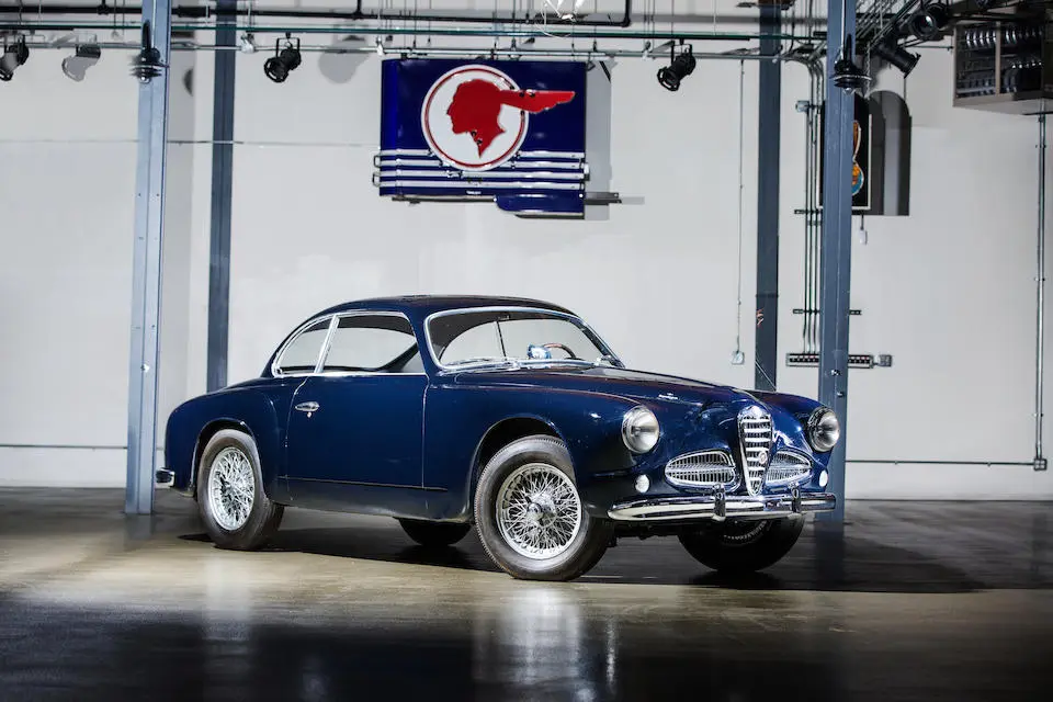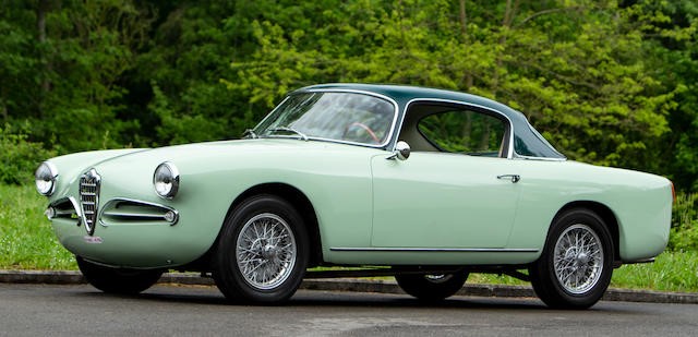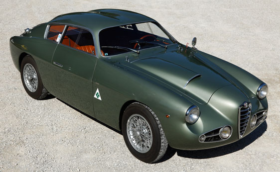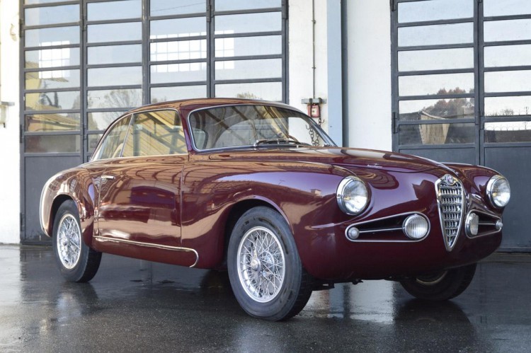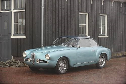 1953 : Lancement d’un projet de coupé hautes performances destiné à une petite série avec l’aide de l’ingénieur autrichien Rodolfo Hruska qui a rejoint l’équipe technique de AR 1900 après avoir participé à l’élaboration des Cisitalia. Ces travaux aboutissent à la « Sportiva », avec Nuccio Bertone (ami de Hruska), chargé du dessin de la voiture (en fait Franco Scaglione). Le châssis tubulaire est proche de celui de la Disco Volante, la voiture reçoit un pont de Dion et les freins arrières in-board sont surdimensionnés, montés très près du différentiel. Mécaniquement le moteur reçoit un arbre à cames plus pointu et sa course est augmentée de 0,5mm pour cuber 1997 cm3. Il dispose d’une lubrification par carter sec avec radiateur d’huile et l’alimentation se fait par 2 carburateurs Weber 50 DCO3 avec système d’aspiration spécifique alimenté par une prise d’air à l’entrée de la calandre. la puissance passe à 138 chevaux à 6500 tours.