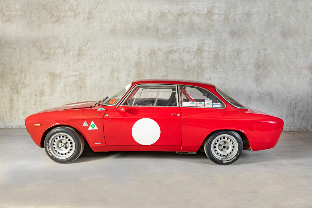 AR 613311 : 07/06/1965, 1300 GTA, jantes magnésium 6/7 pouces, cloche de boîte magnésium, gros carter d’huile en magnésium, gros radiateur d’huile, reniflard Autodelta, tubulures agrandies et polies, arbres à cames spéciaux, carburateurs Weber 45 DCOE, réservoir 60 l, intérieur plastique léger, boîte de vitesses à rapports rapprochés, rapport de pont 8/41, barre antiroulis arrière, Blanc, intérieur noir.