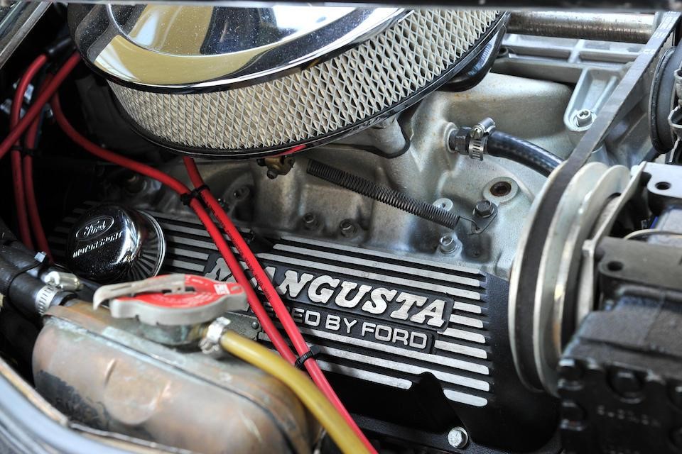 Bloc en fonte d’origine Ford Fairlane (meilleure fiabilité) retravaillé par De Tomaso, pistons en aluminium. Distribution par nouvel arbre à cames.