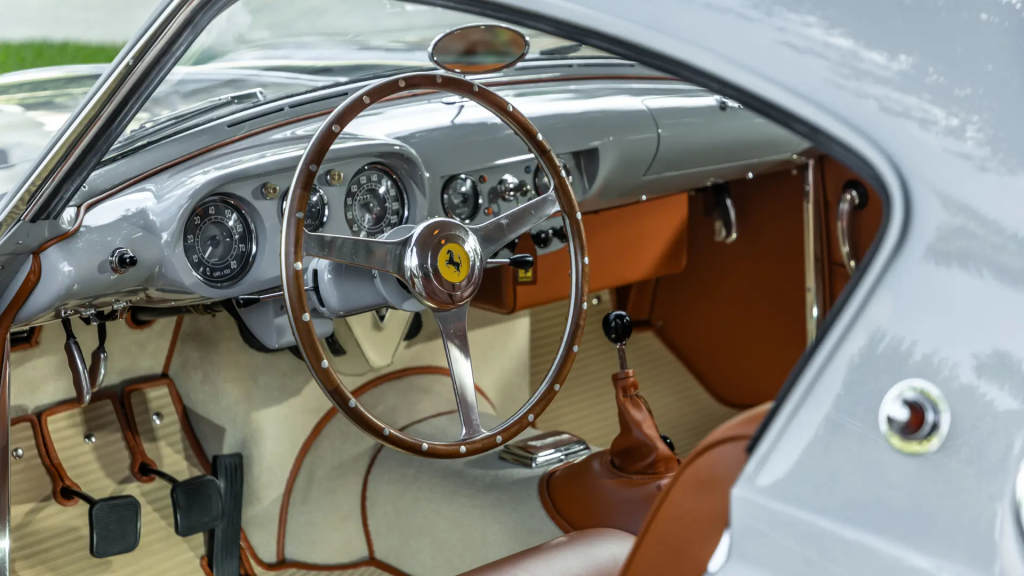 0425 GT : 22/11/1955, 250 GT/Comp. Europa, Berlinette Pinin Farina, carrosserie aluminium par Scaglietti (caisse 12490), 1ère/3, prototypes avec 14 ouïes de custode, 4 ouïes d’aile, petits ailerons arrières avec feux verticaux, empattement 2,48m, tableau de bord spécifique avec chronomètre en partie centrale et thermomètre et altimètre sur le couvercle de boîte à gants, Grigio Metallizzato Max Meyer LC49, intérieur Rosso Pall Mall.