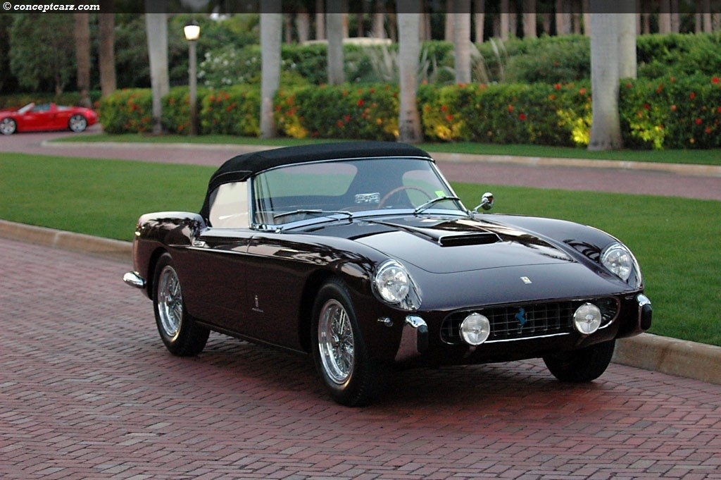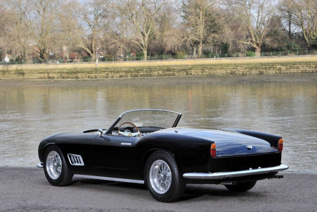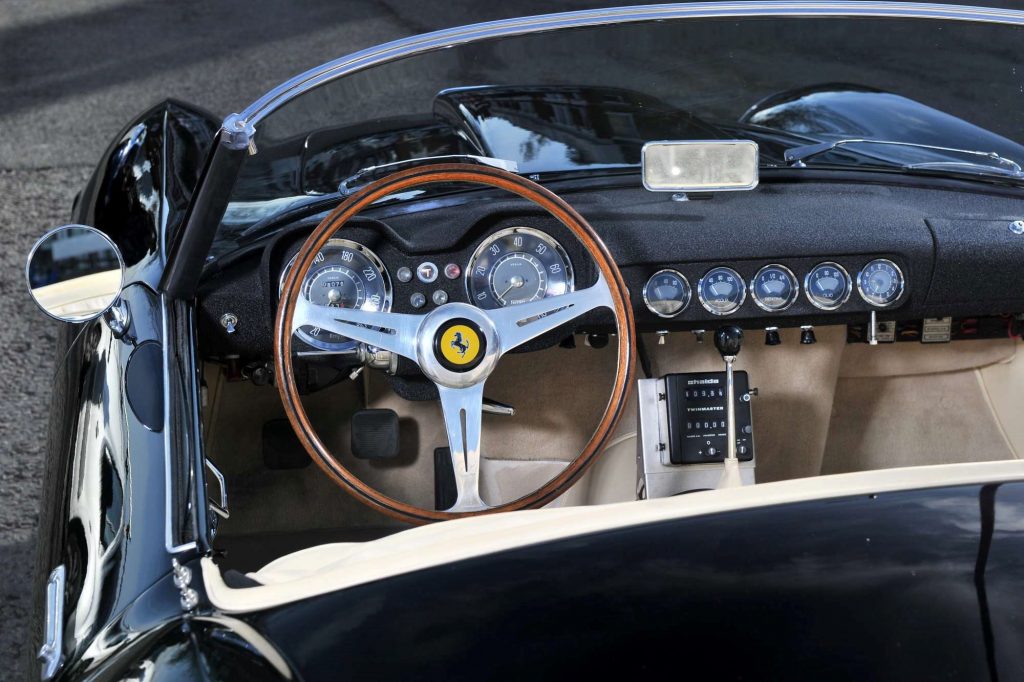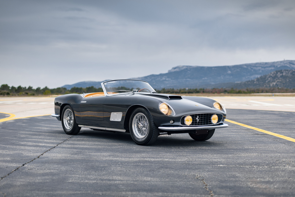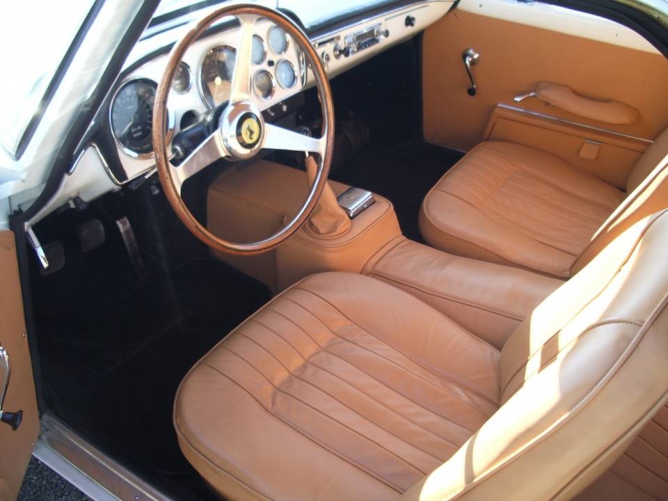 1487 GT : 21/09/1959, 250 GT California Spyder, 31e/50, phares carénés, caisse acier, prise d’air de capot, ouïes d’ailes chromées, moteur Tipo 128D/0496D, arbres à cames Tipo 128C à levée de 9mm, taux de compression 9,3 :1, 3 carburateurs double corps Weber 36 DCL3, 240 ch. DIN@7000, boîte de vitesses Tipo 233 DR, freins à tamboirs, pas de goulotte de remplissage d’essence extérieure, Noire, cuir rouge .