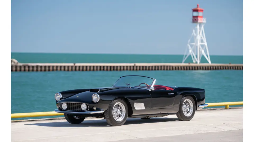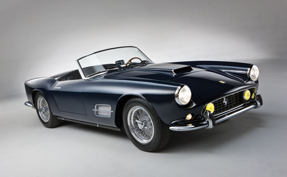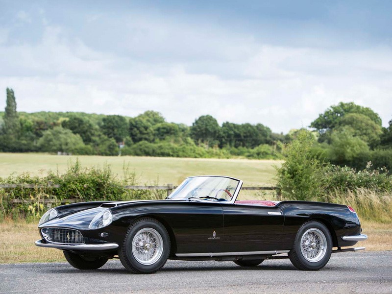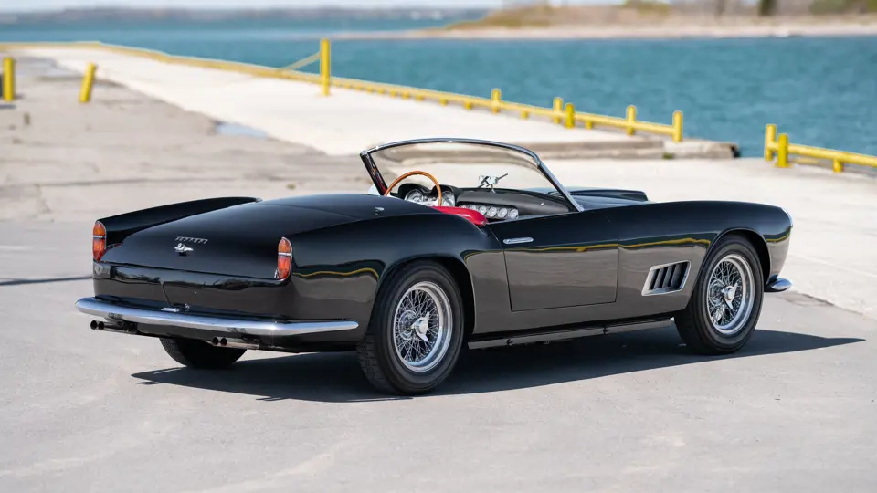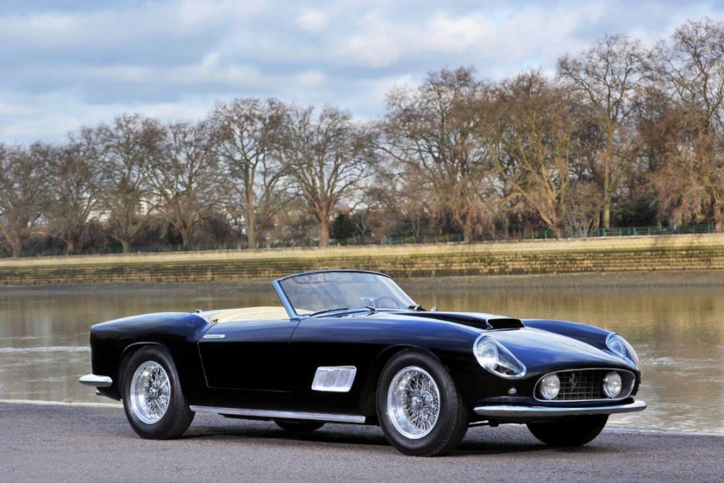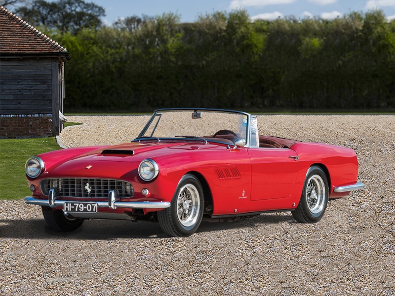 1487 GT : 21/09/1959, 250 GT California Spyder, 31e/50, phares carénés, caisse acier, prise d’air de capot, ouïes d’ailes chromées, moteur Tipo 128D/0496D, arbres à cames Tipo 128C à levée de 9mm, taux de compression 9,3 :1, 3 carburateurs double corps Weber 36 DCL3, 240 ch. DIN@7000, boîte de vitesses Tipo 233 DR, freins à tamboirs, pas de goulotte de remplissage d’essence extérieure, Noire, cuir rouge .