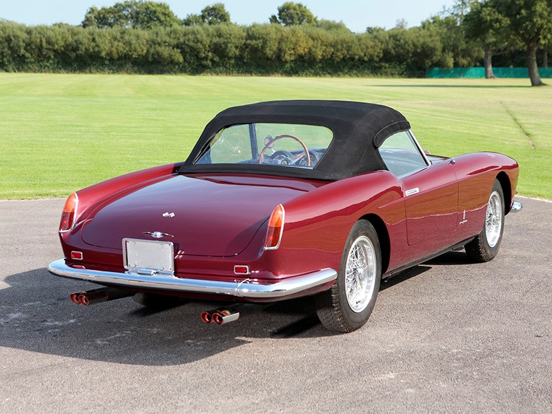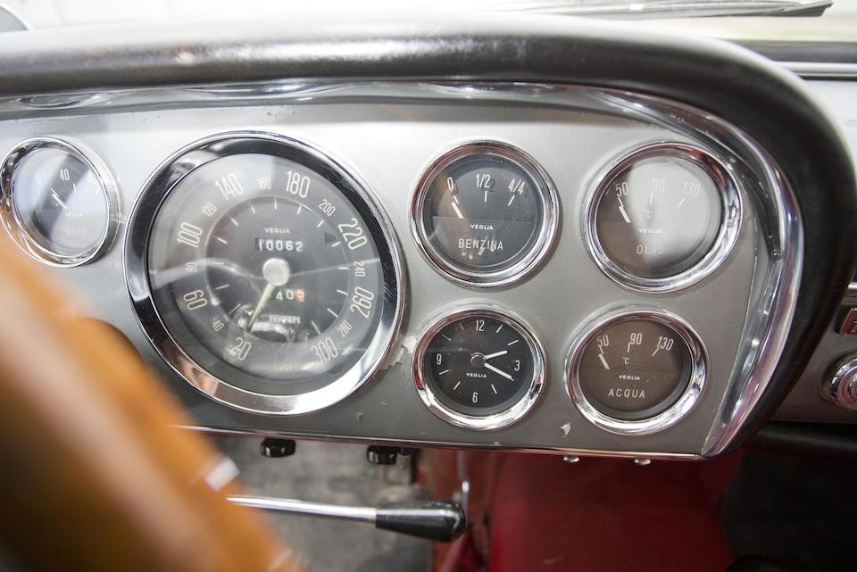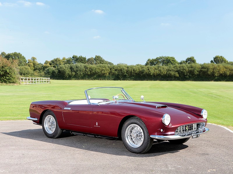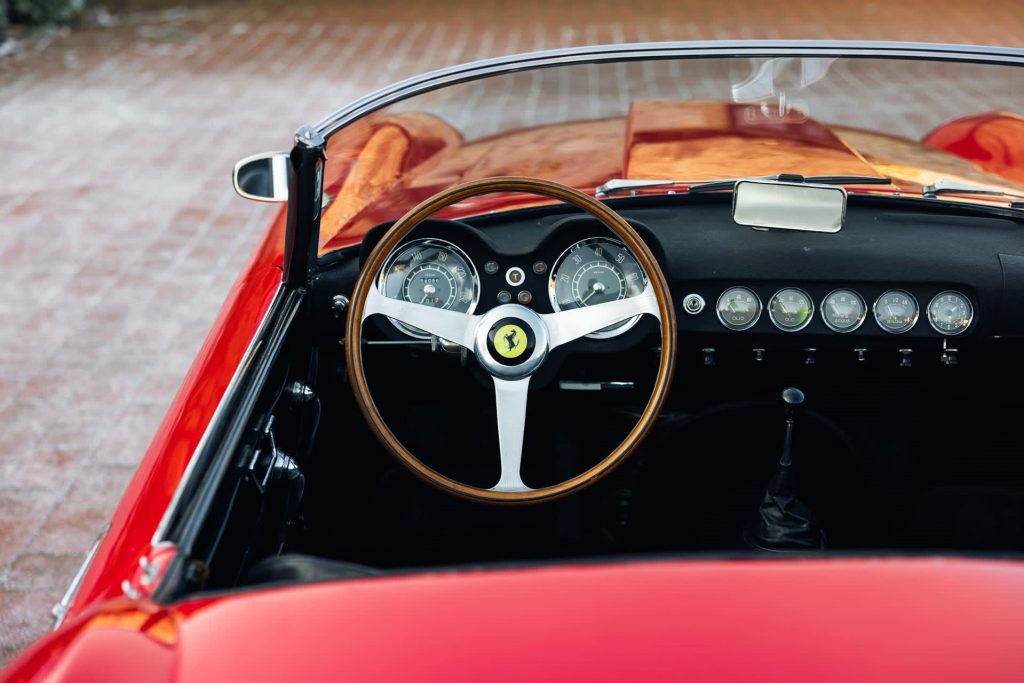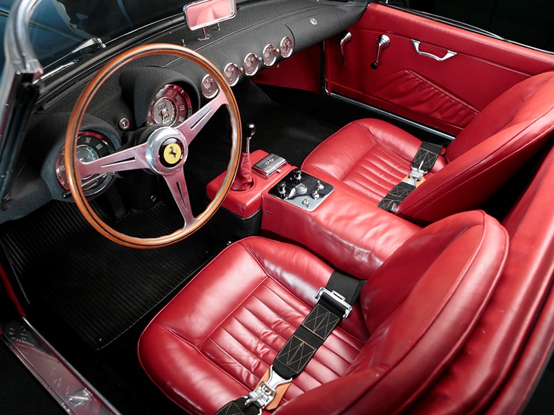 1011 GT : 09/1958, 250 GT Spyder California par Pinin Farina, 10e/50, LWB, moteur Tipo 128D, à bougies intérieures, admission à 6 conduits, soupapes sur roulements à aiguilles, taux de compression 8,8 :1, caisse acier, rapport de pont 7×32, phares carénés, rouge, cuir noir.