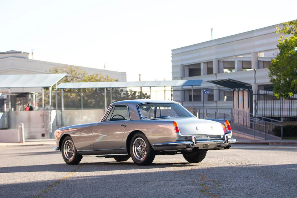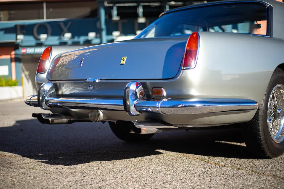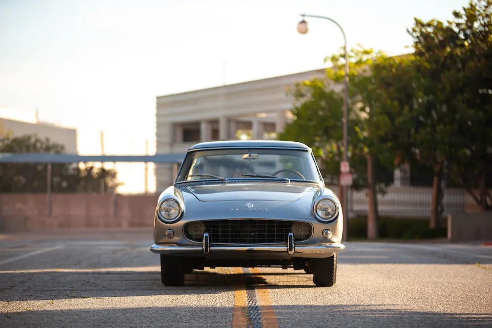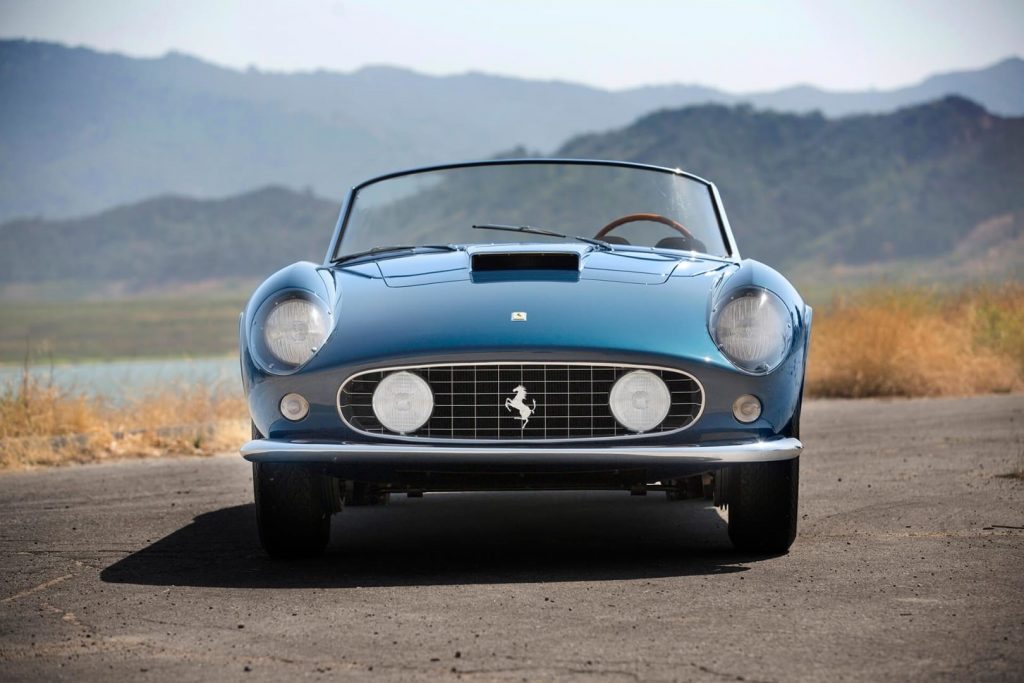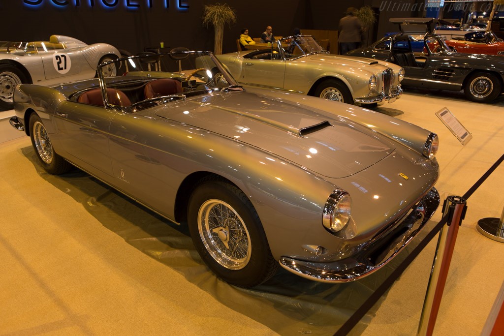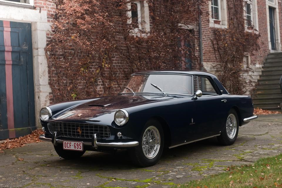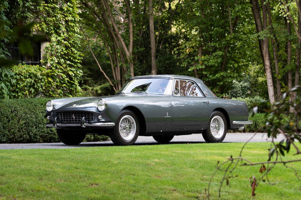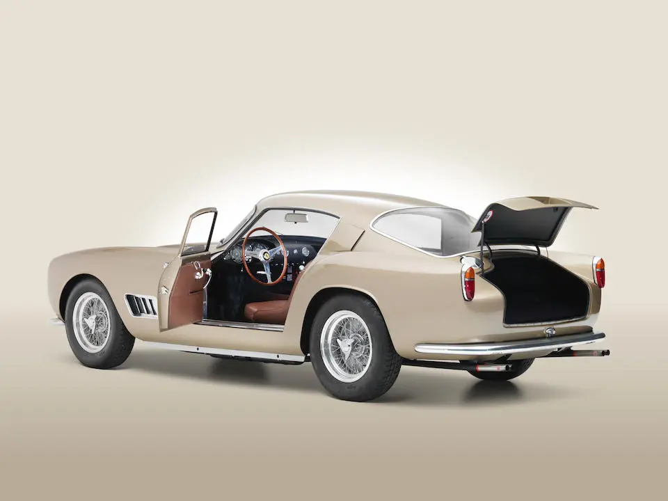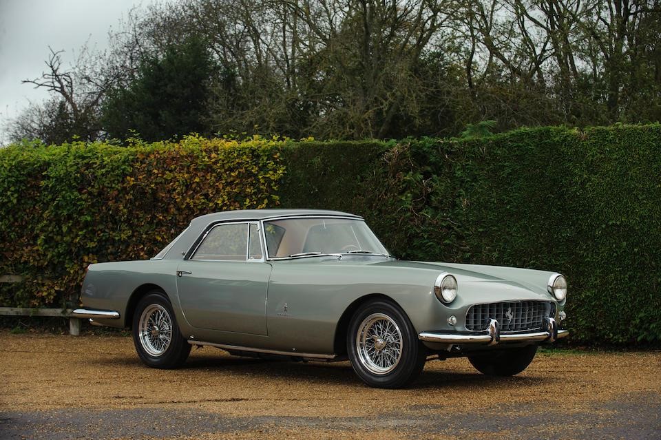 1007 GT :  06/11/1958, 250 GT Coupé Pinin Farina Speciale, logos spécifiques avec sigle Ferrari et cheval cabré sur la face avant en place de l’écusson à fond jaune, sigle Ferrari spécifique sur la malle arrière, embouts d’échappement chromés, tableau de bord garni de cuir bleu, capot et couvercle de malle en fibre de verre, Grigio Conchiglia, cuir bleu, moquette grise.