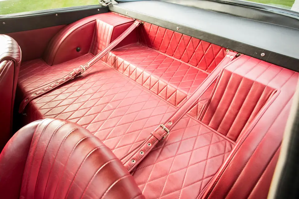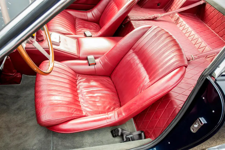 Rouge, cuir noir, climatisation, jantes Borrani.