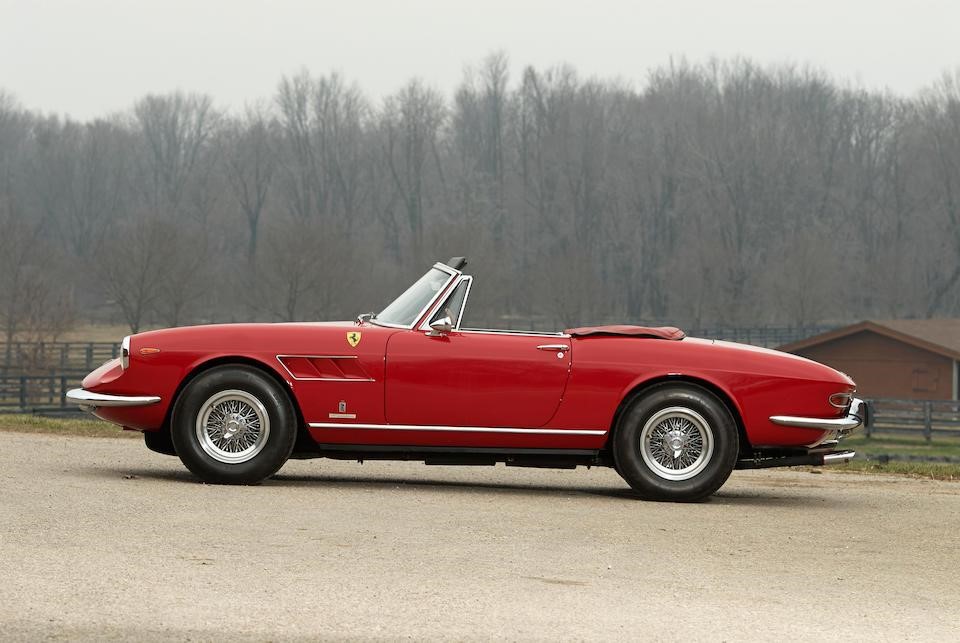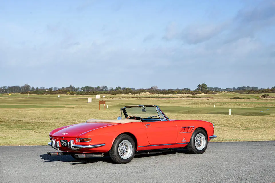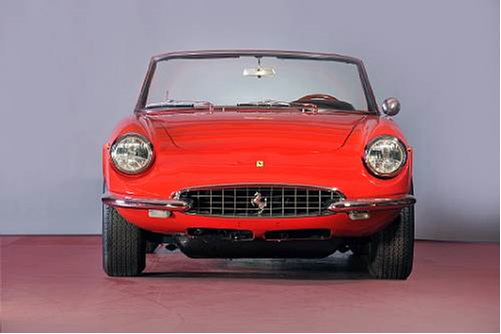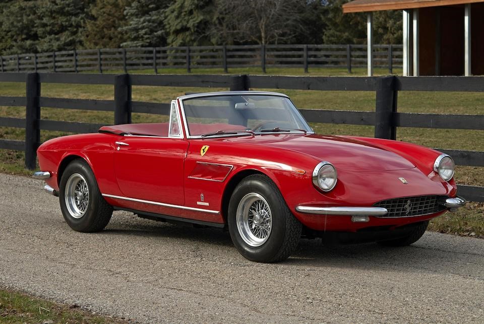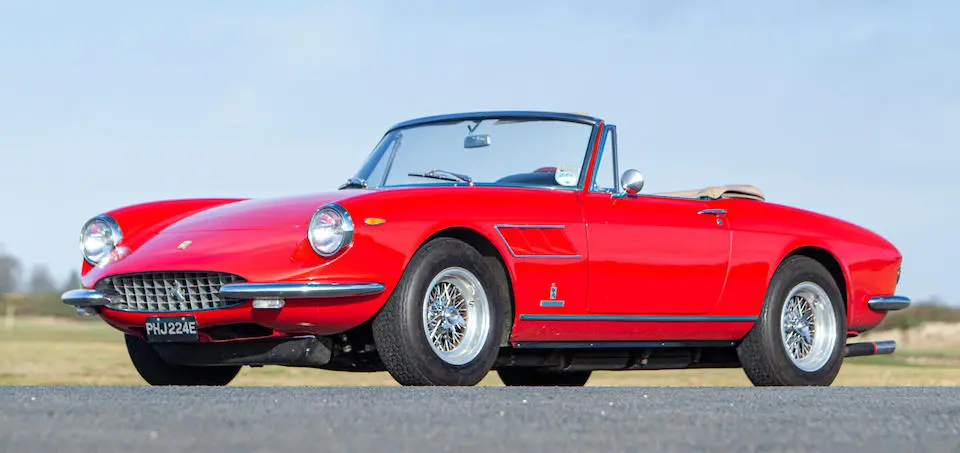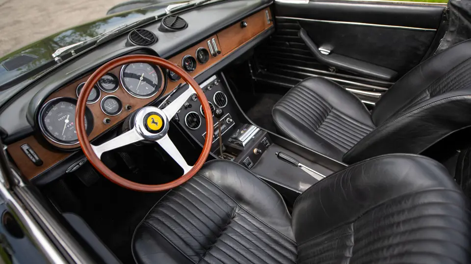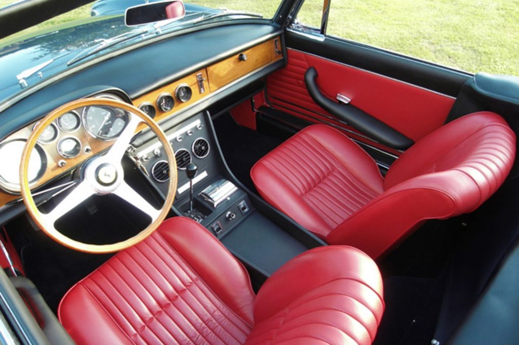 11033 : 1968, 330 GTS Spider, 6 carburateurs double corps Weber, 3e siège central, Giallo Fly, cuir rouge.