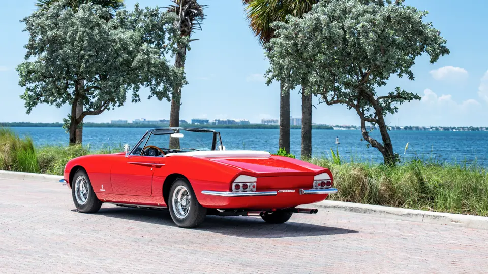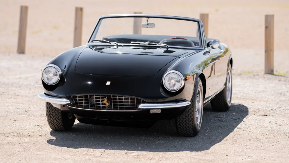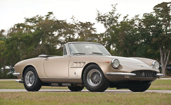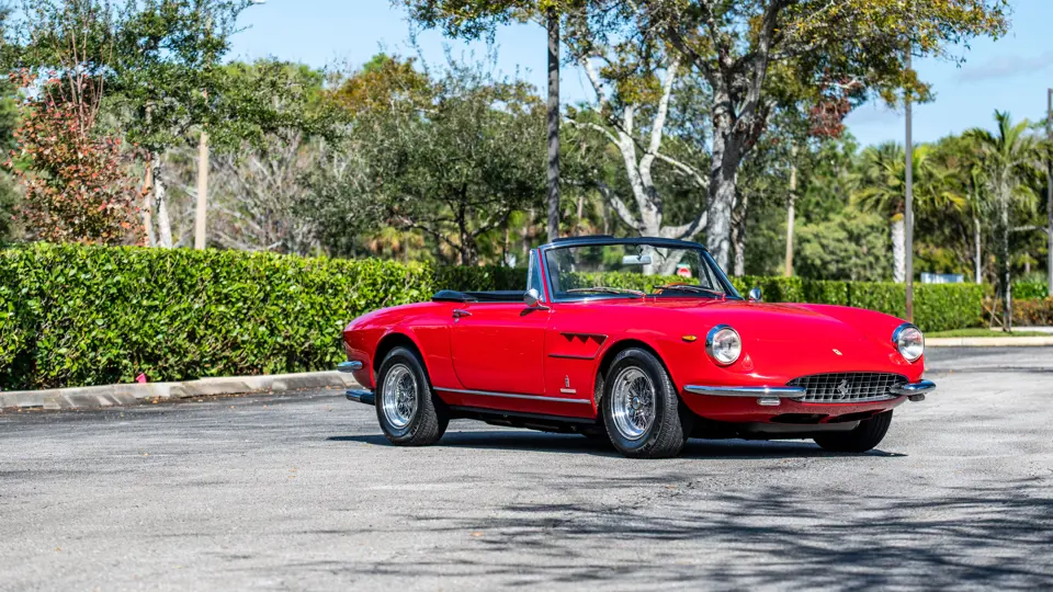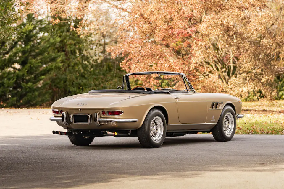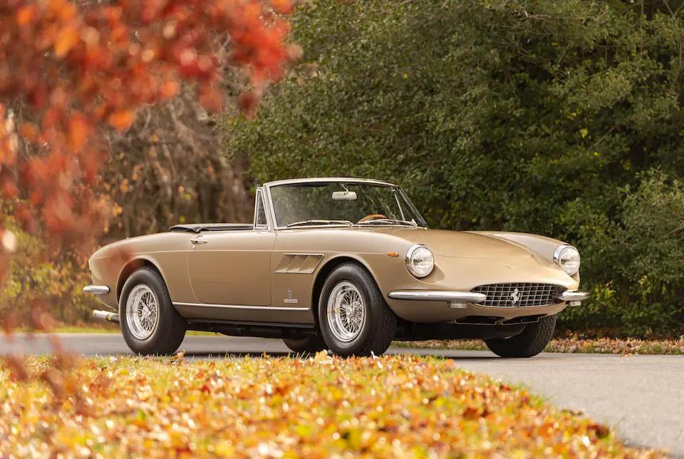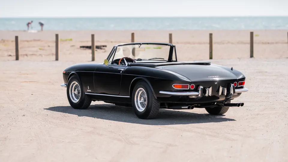 11033 : 1968, 330 GTS Spider, 6 carburateurs double corps Weber, 3e siège central, Giallo Fly, cuir rouge.