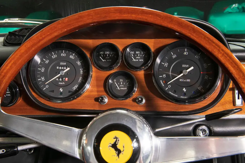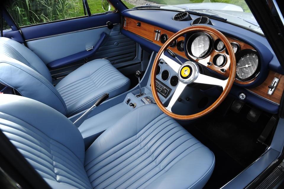 11173 : 04/1968, 330 GTS, moteur 1173, Turchese Chiaro (bleu), cuir orange, tachymètre en kilomètres.