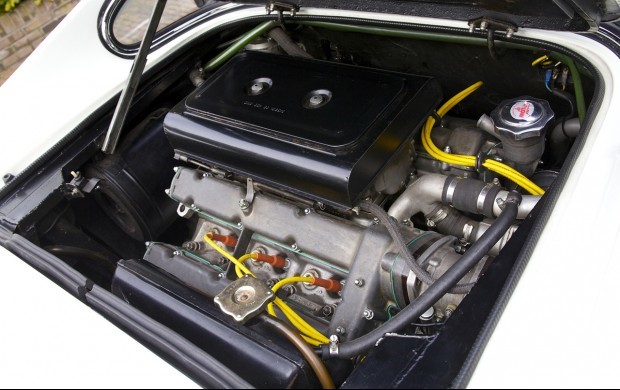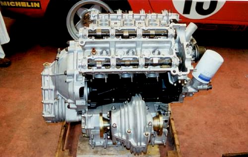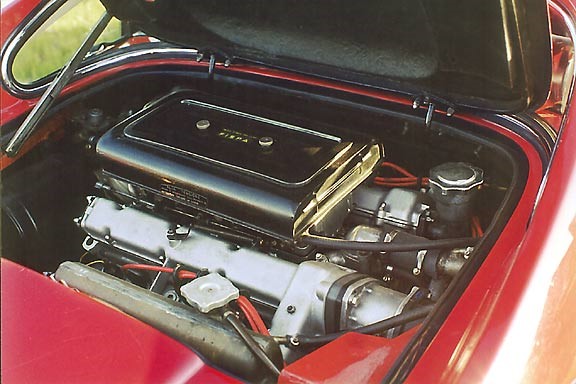 6 cylindres en V à 60° entièrement en alliage léger (silumine) en position centrale, transversale étudié avec la participation d’Aurelio Lampredi. Chaque moteur est essayé au banc avant montage dans la caisse.
