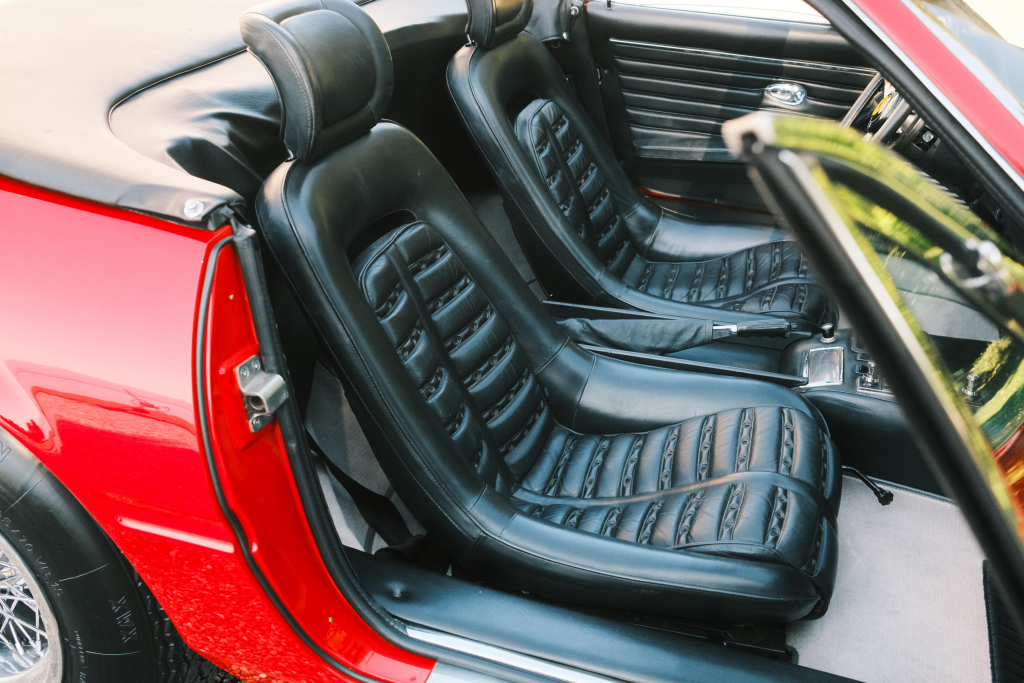 17045 : 1973, 365 GTS/4, Spider, normes US, Rosso Dino Ferrari, cuir naturel, climatisation, radio Becker, jantes à rayons Borrani.