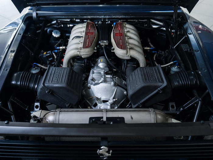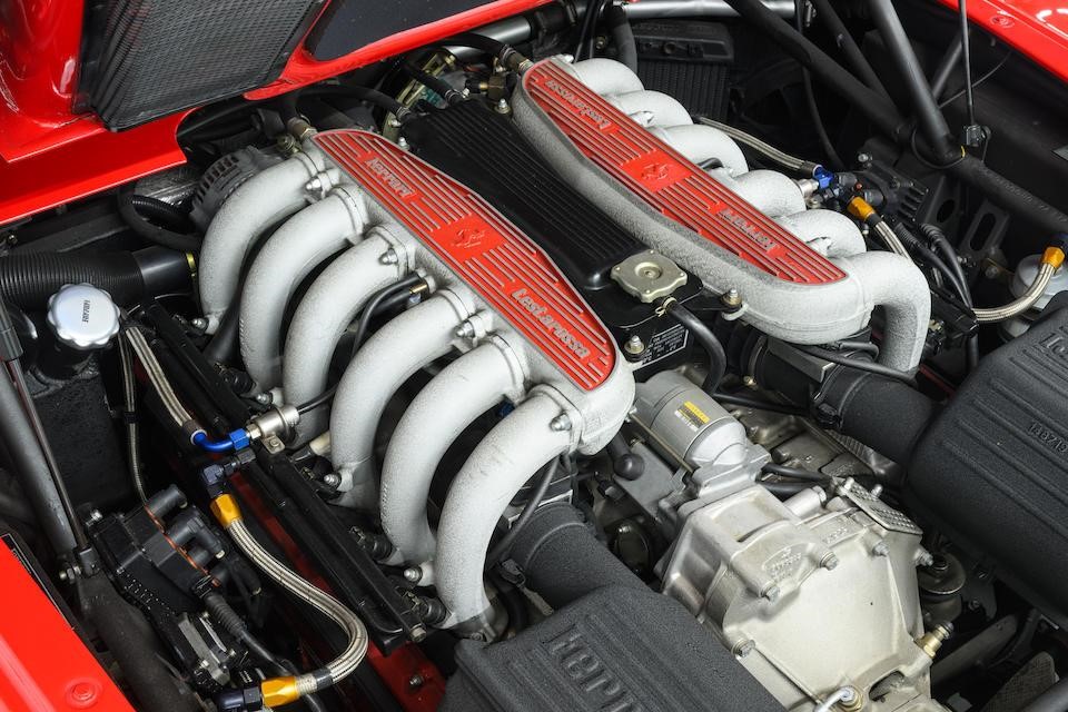 Un moteur à plat donne une faible hauteur du bloc, mais une grande largeur. Le Tipo 113 F de la Testarossa est réalisé par l’ingénieur Giuliano de Angelis avec une équipe de 12 spécialistes. Ce bloc reprend les côtes internes de la 365 V12, 4390 cm3 (81×71). Il est ouvert à 180°, utilise pistons et bielles de la Daytona mais le bloc en silumine coiffé de culasses peintes en rouge est nouveau, de même que les chemises en fonte et le vilebrequin à 7 paliers.