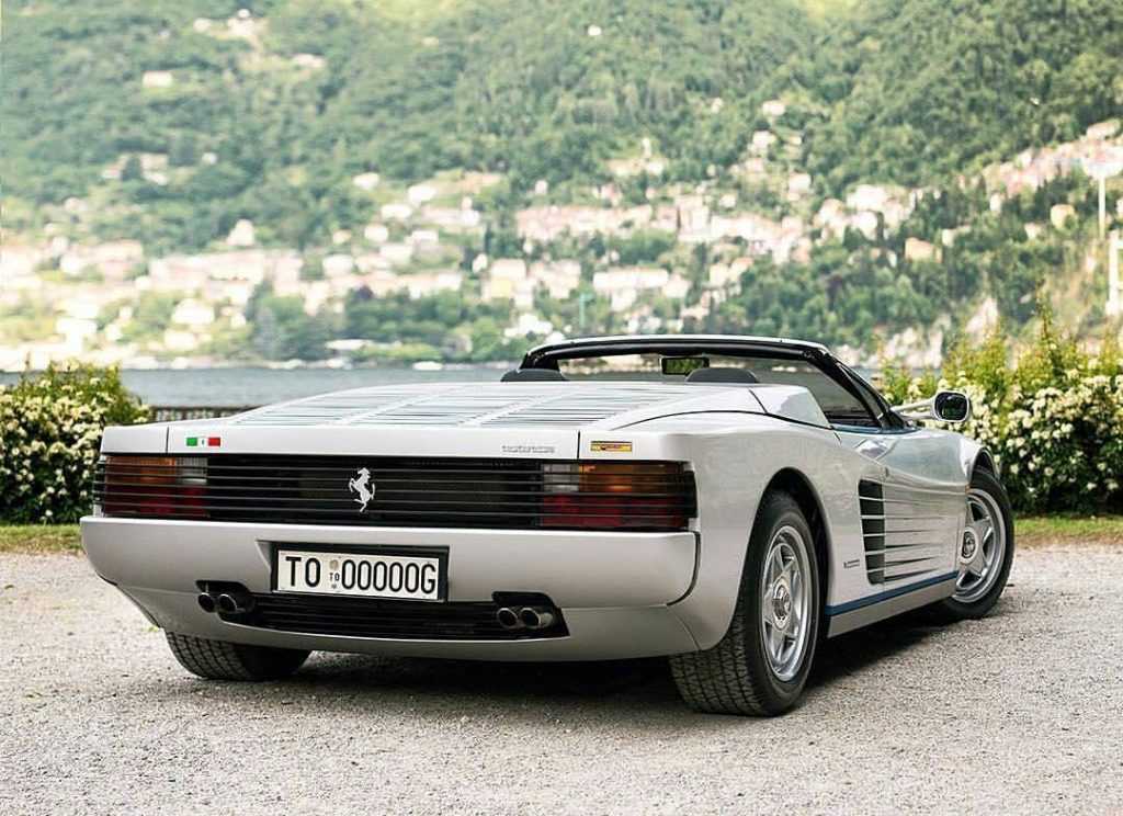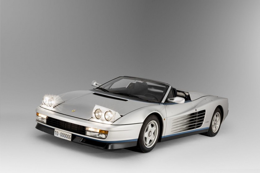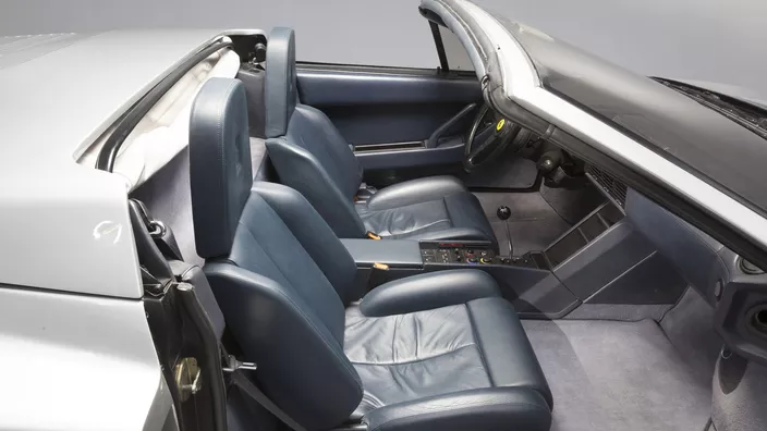 ZFFTA30B000062897 : 1986, Testarossa Spider, caisse unique par Pininfarina (livrée 27/02/1986, caisse N°1), moteur F113A-518, boîte de vitesses F110B-890, arceau à commande électrique avec couvre-capote, embrayage automatique Valeo, commande par bouton sur la console escamotant la pédale d’embrayage, Argento 101/C, bandes bleues Blu 3282, cuir noir, moquette Blu 168.