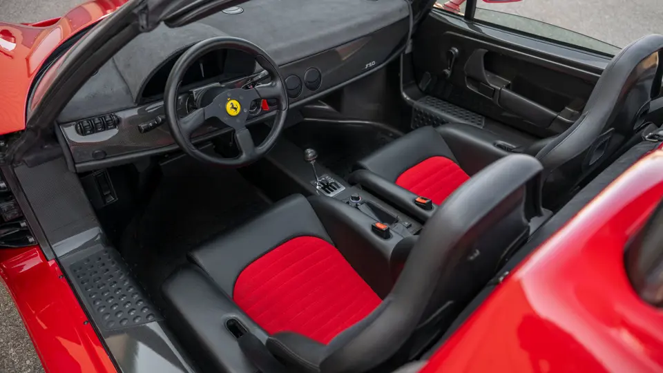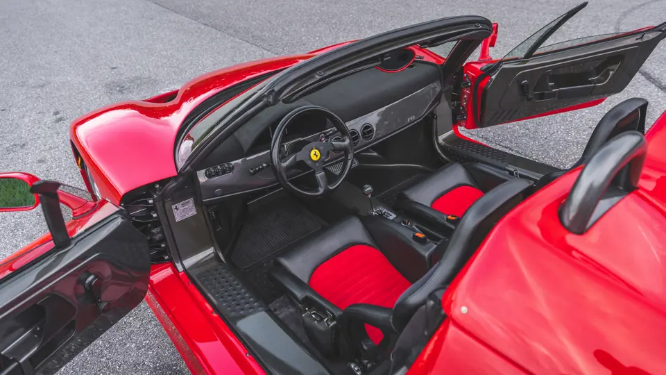 104063 : 19/12/1995, Rosso Corsa (FER 300/12DS), cuir noir (VM8500) à passepoils rouges, hardtop rouge, capote toile noire, paire de chaussures de conduite F50, set de bagages spécifiques.