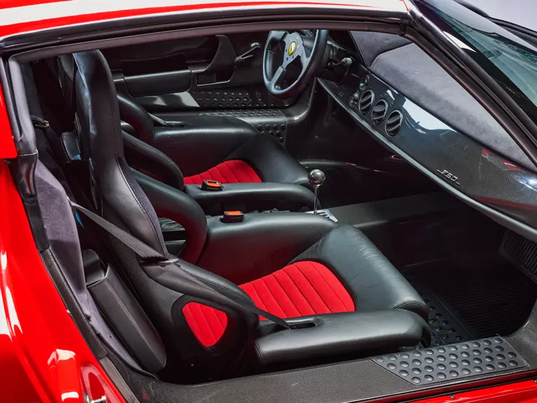104063 : 19/12/1995, Rosso Corsa (FER 300/12DS), cuir noir (VM8500) à passepoils rouges, hardtop rouge, capote toile noire, paire de chaussures de conduite F50, set de bagages spécifiques.